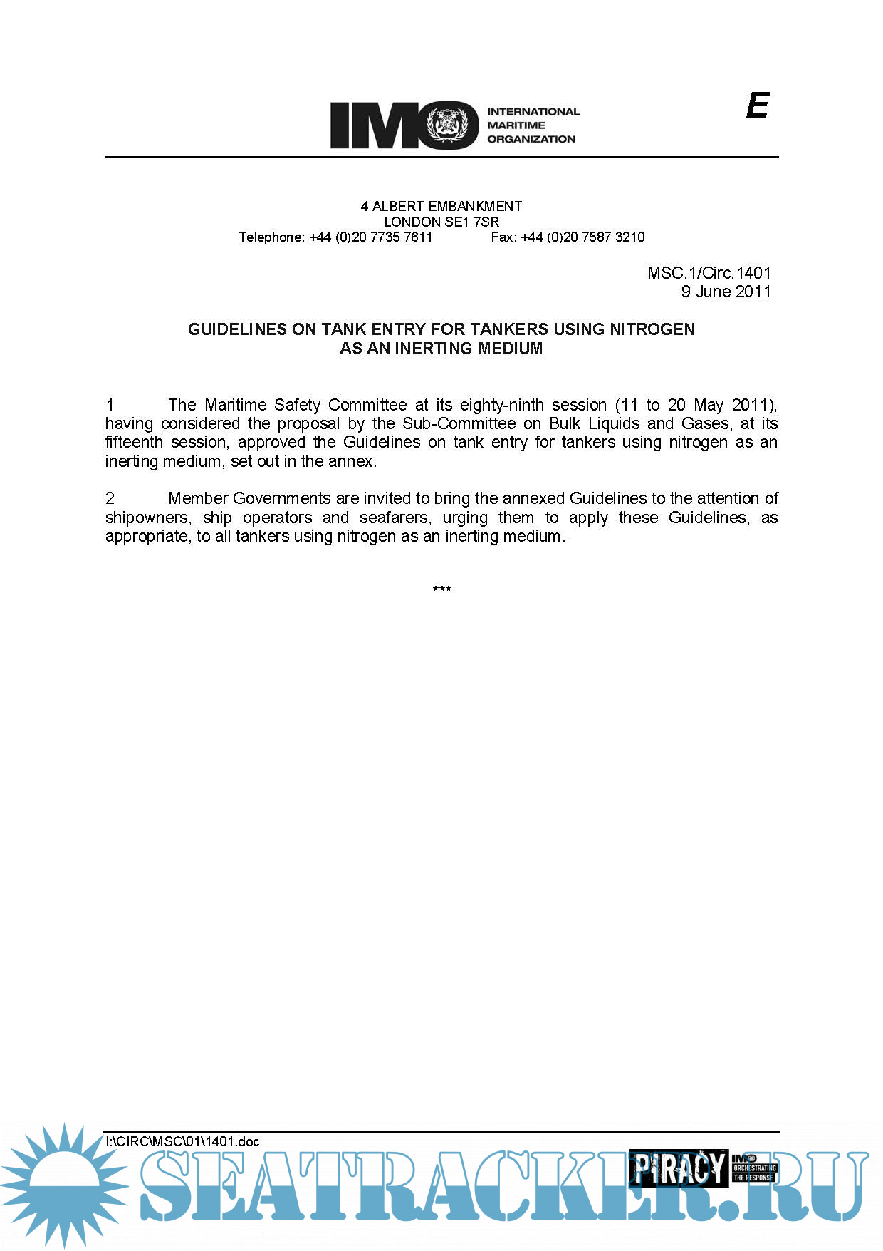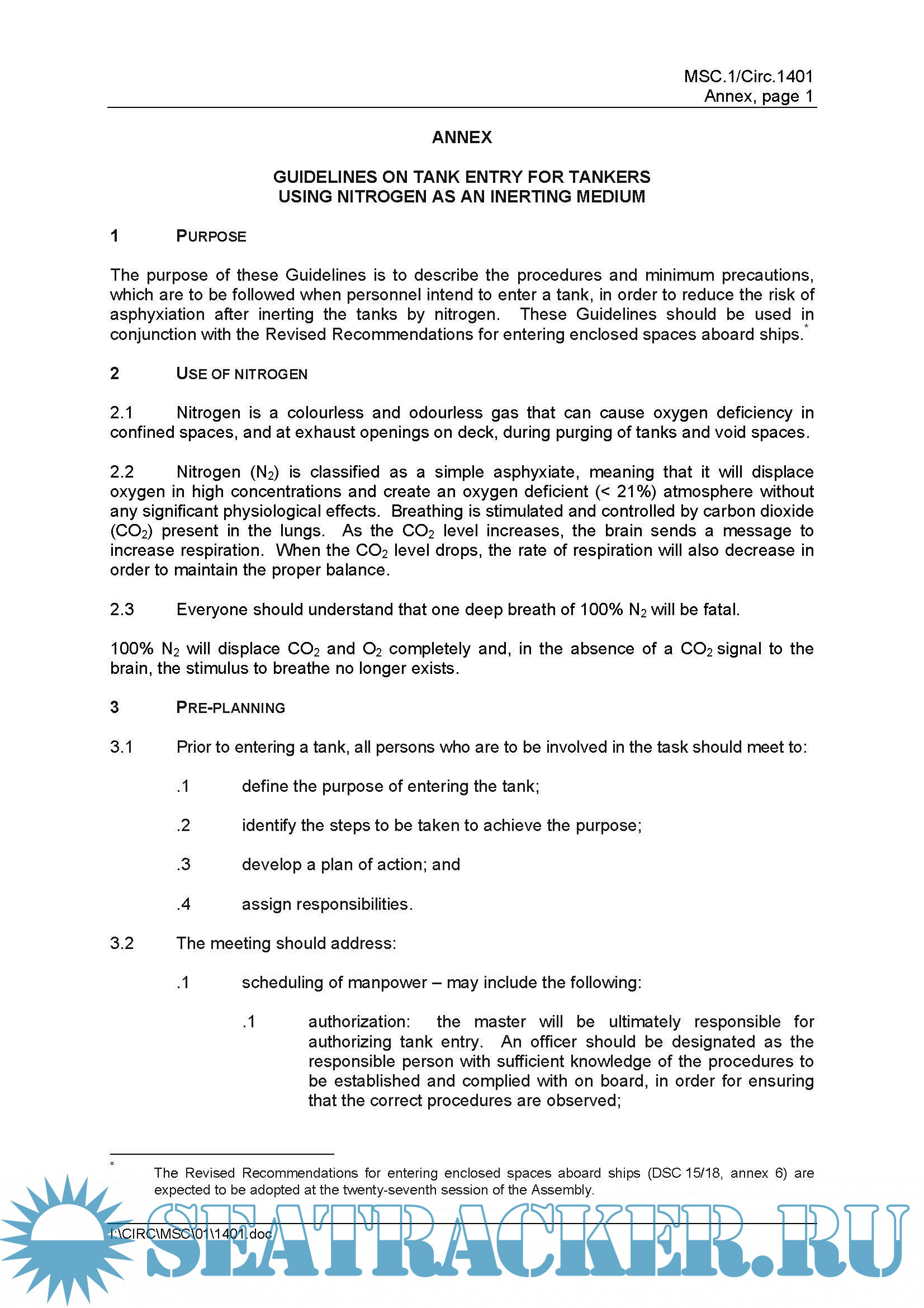 1. MSC.1/Circ.1401 (Guidelines on Tank Entry for Tankers Using Nitrogen as an Inerting Medium). (10 Pages)