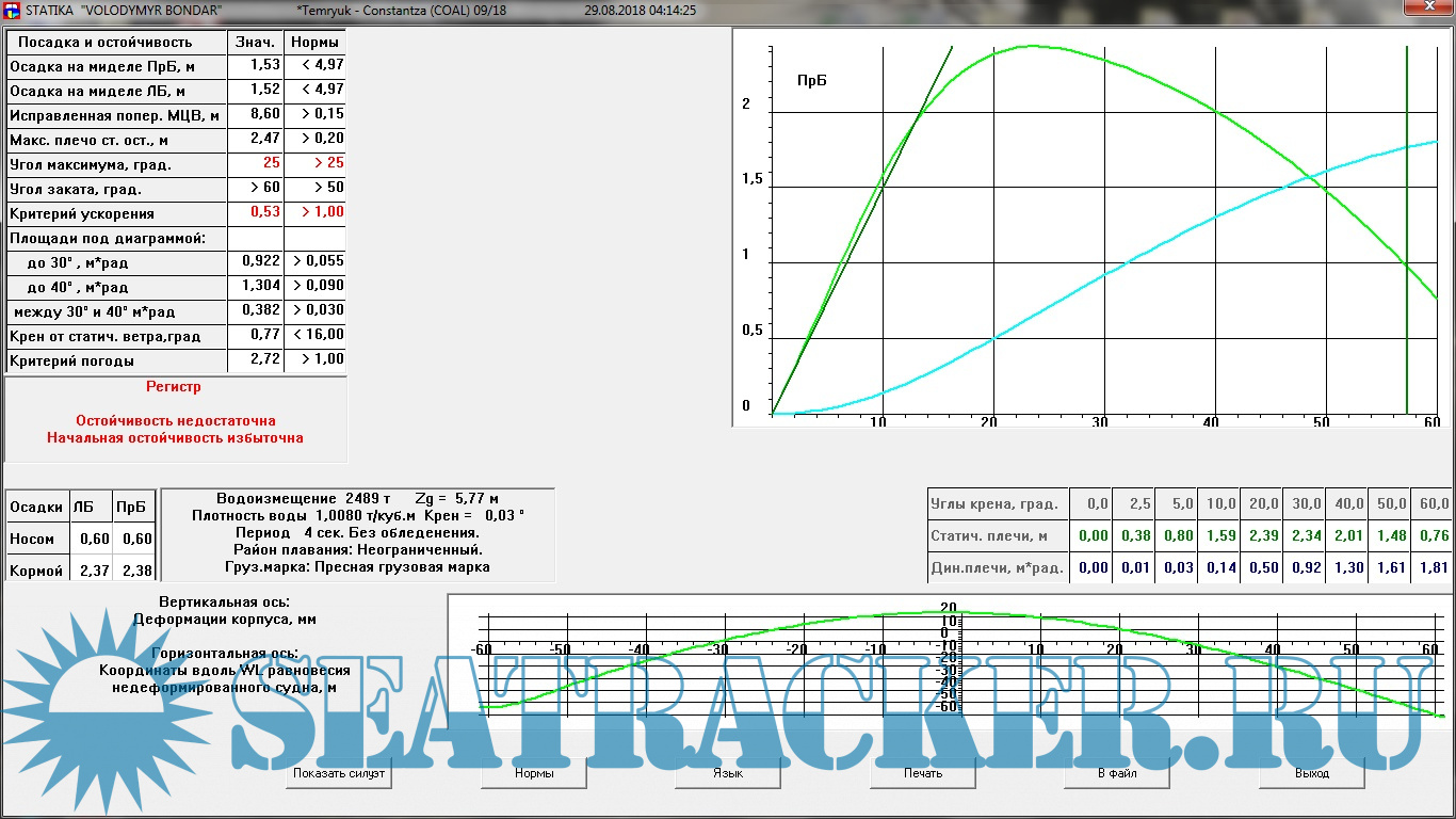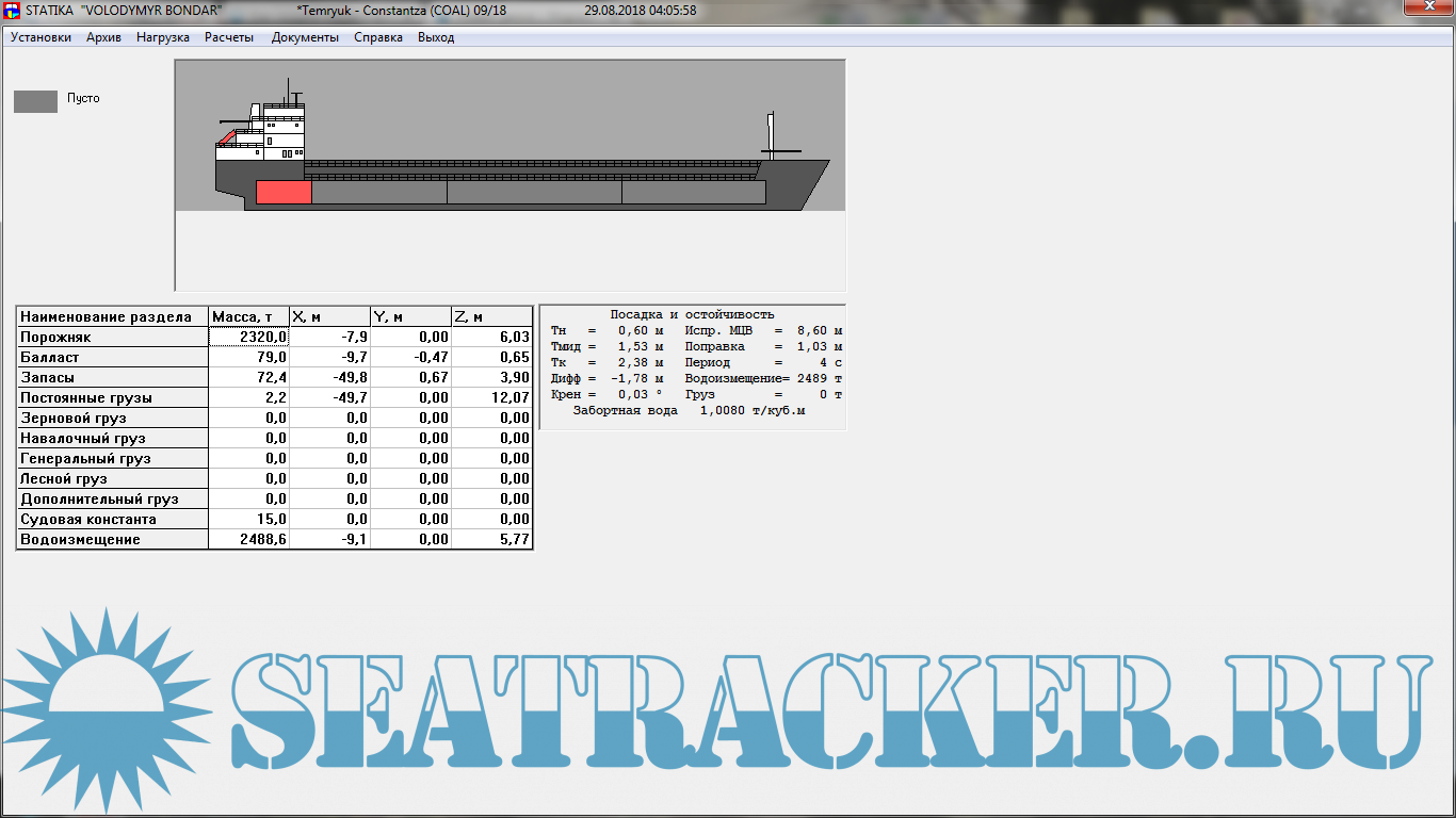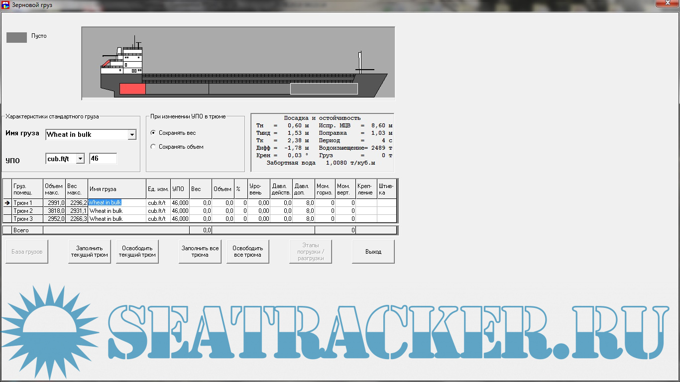 Описание: Программа предназначена для составления планов загрузки судов, контроля остойчивости, аварийной остойчивости, продольной прочности, а также для ежедневного учёта изменения судовых запасов. Алгоритм программы позволяет вычислять гидростатические элементы и параметры остойчивости для любого заданного судна.