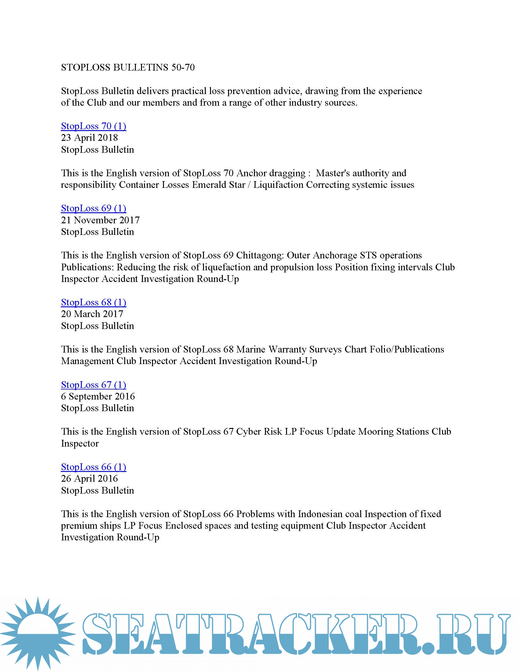 Year: 2018 Language: english Author: The London P&I Club Genre: Collection of books Format: PDF Quality: eBook Pages count: 84 Description: StopLoss Bulletin delivers practical loss prevention advice, drawing from the experience of the Club and our members and from a range of other industry sources.