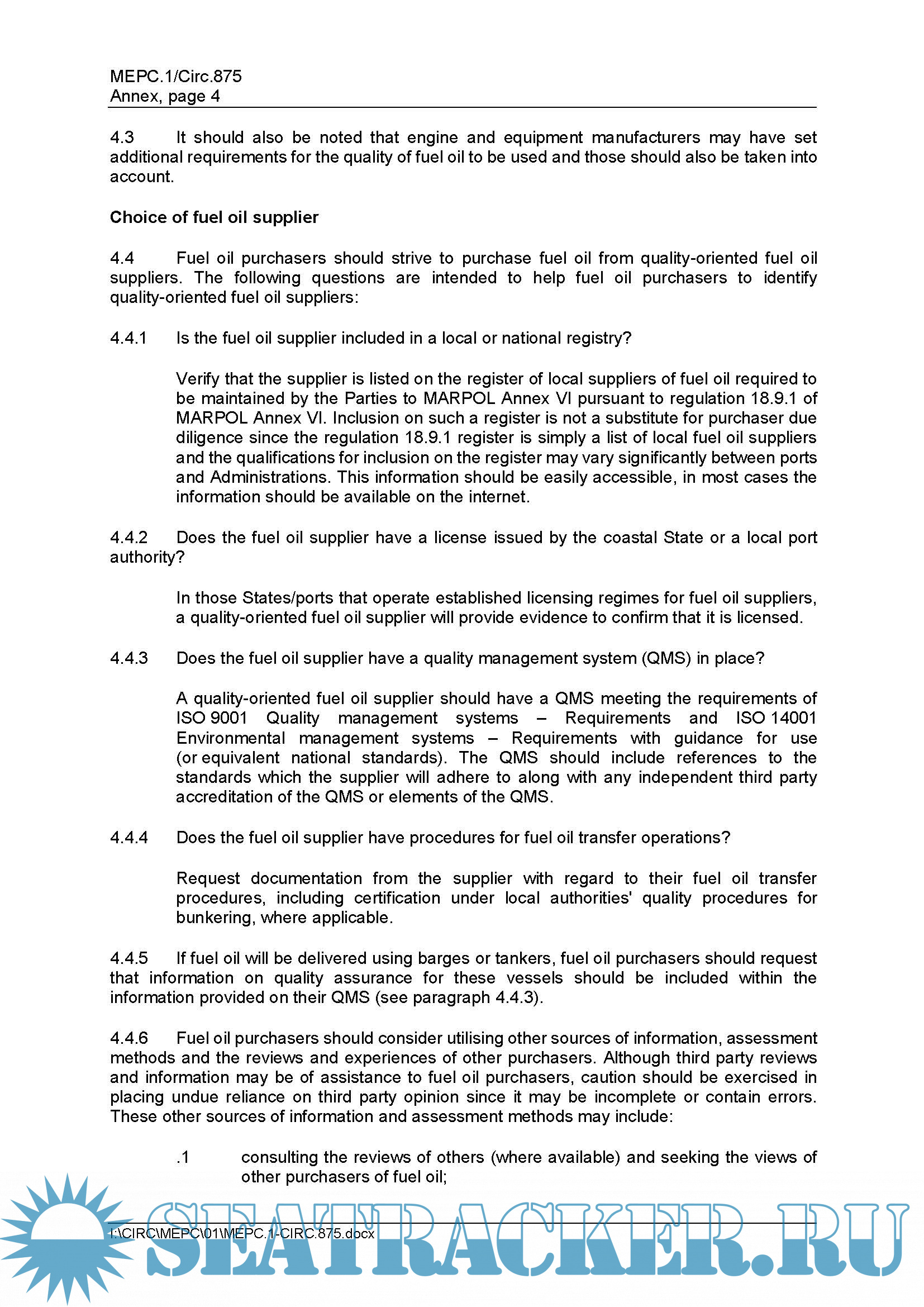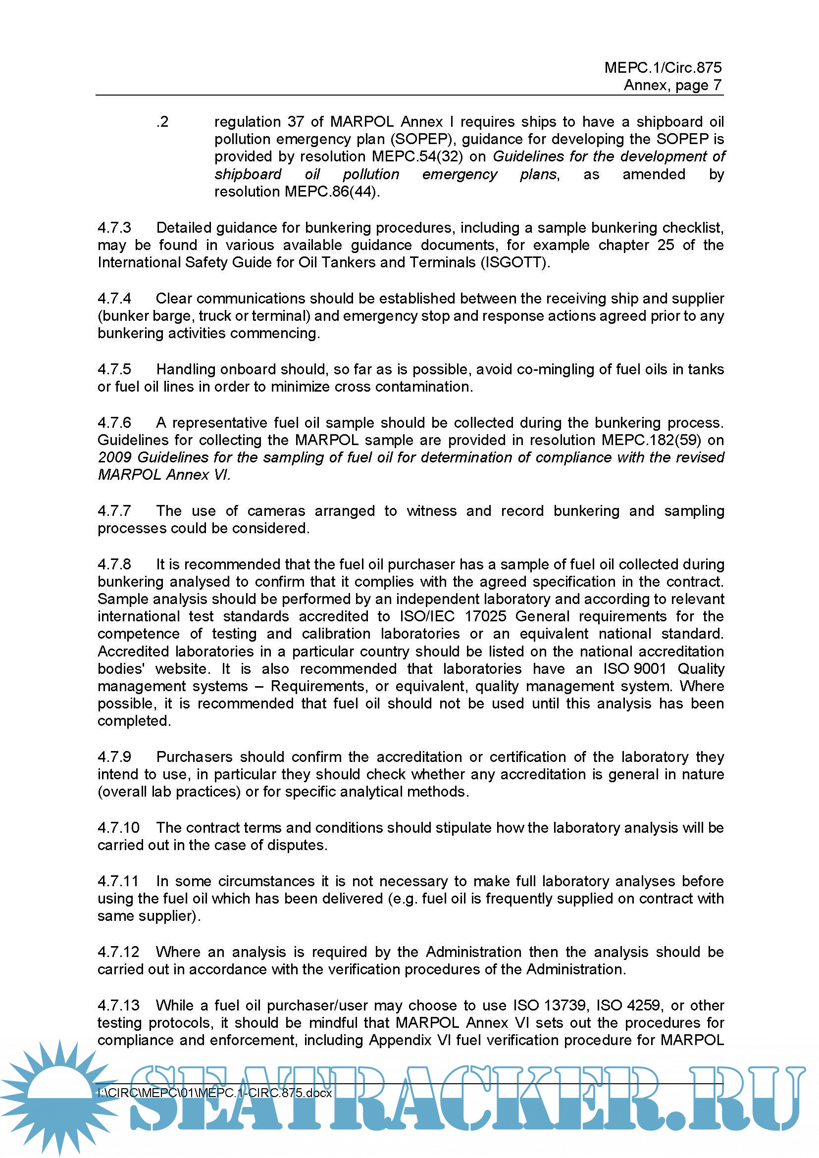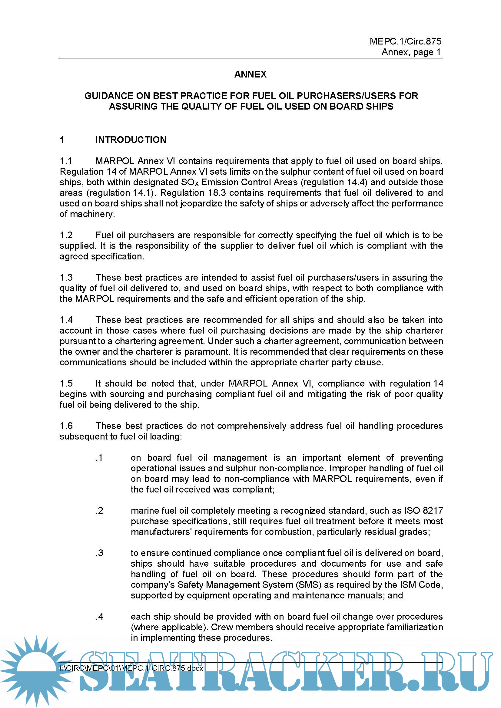 Guidance on Best Practice for Fuel Oil Purchasers/Users for Assuring the Quality of Fuel Oil Used on Board Ships MEPC.1/Circ.875