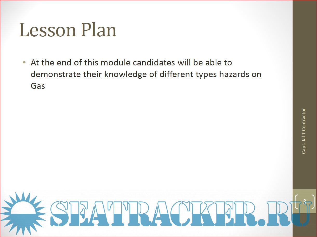 Year: 2017 Language: english Author: Capt. Jal T. Contractor Genre: Presentation Format: PDF Quality: eBook Pages count: 59 Description: At the end of this module candidates will be able to demonstrate their knowledge of different types hazards on Gas.
