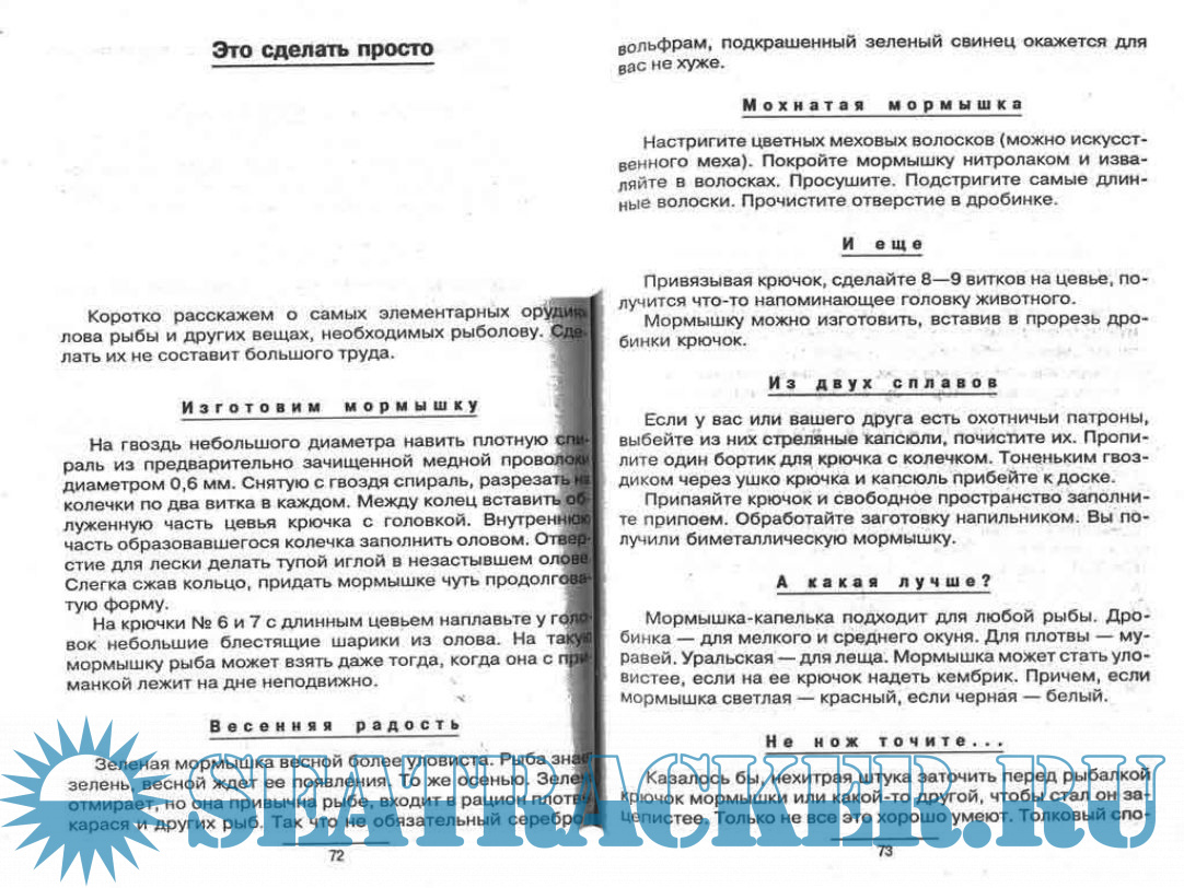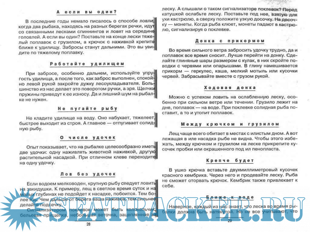 Описание: В книге собраны советы опытного рыболова по разным видам летней и зимней рыбалки. По характеру книга является справочником, содержащим емкие советы: как выбрать и оснастить удилище, приготовить насадку и подкормку, где найти естественную наживку и как ее сохранить, где искать и ловить рыбу. В книге содержится более трехсот советов по рыбалке и оборудованию снастей, необходимых и начинающему, и опытному рыболову.