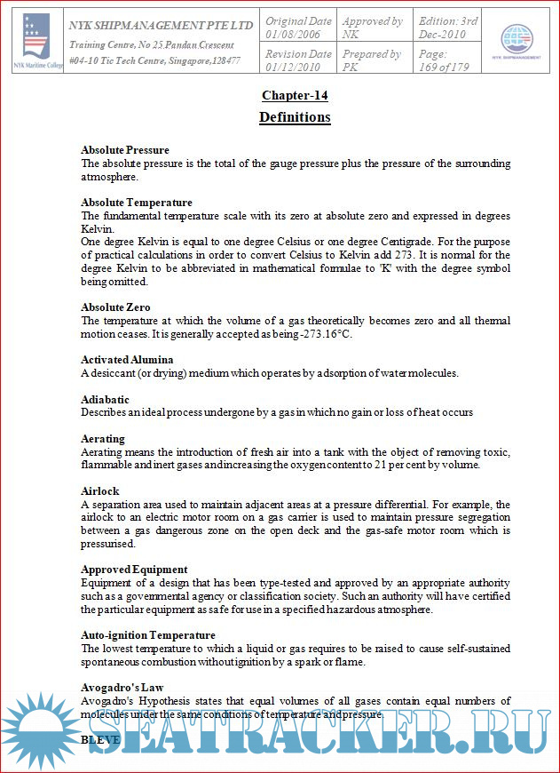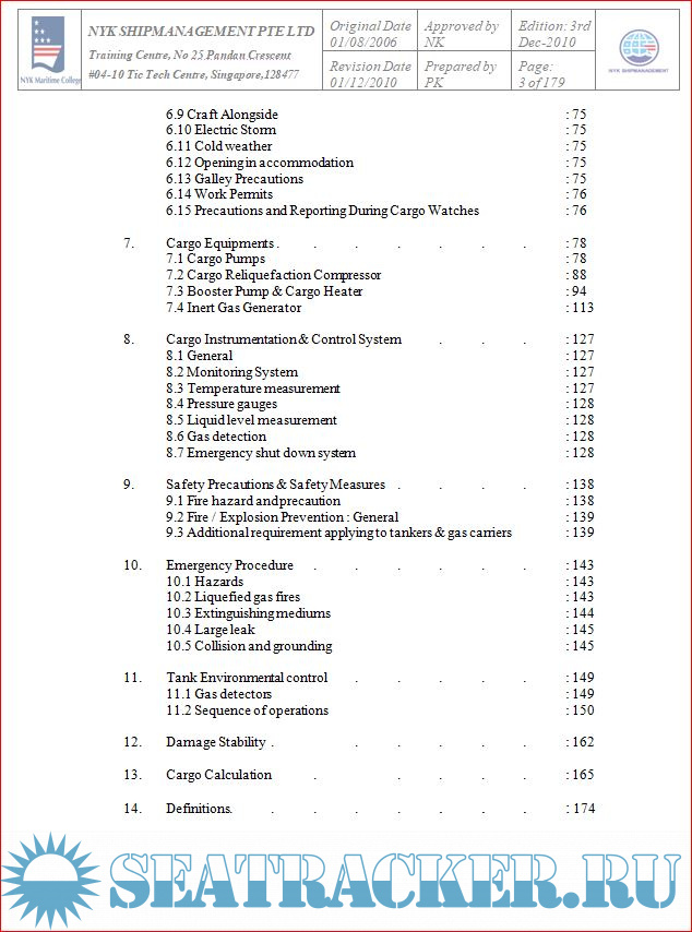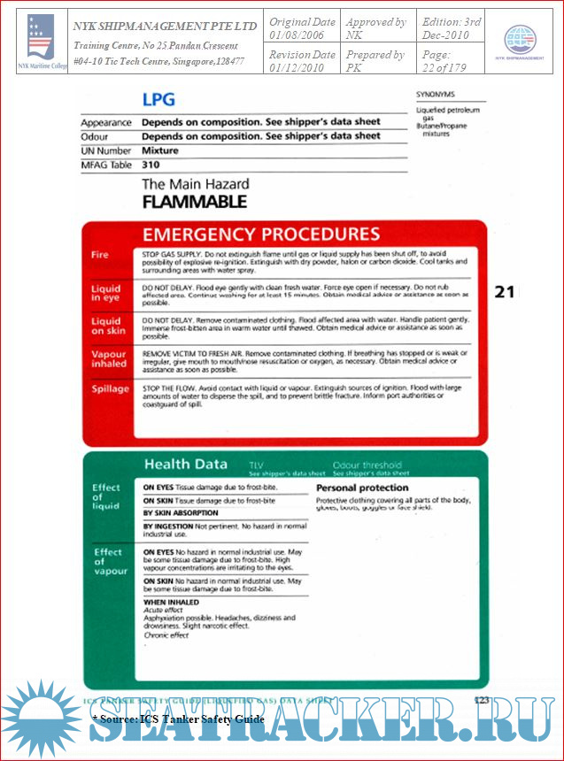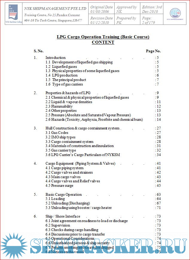 Year: 2010 Language: english Author: NYK Maritime College Genre: Training courses Publisher: NYK Maritime College Edition: 3rd Format: DOC Quality: eBook Pages count: 179 Description: This course explains the basics of Liquefied Petroleum Gas (LPG) Carriers industry, their operation, applicable statutory and special requirements including safety related matters concerning the type of cargo grades, etc. Participants will gain a deep and qualitative understanding of ‘Liquefied Petroleum Gas (LPG)’ sector in connection with the IMO Convention and IGC Code.