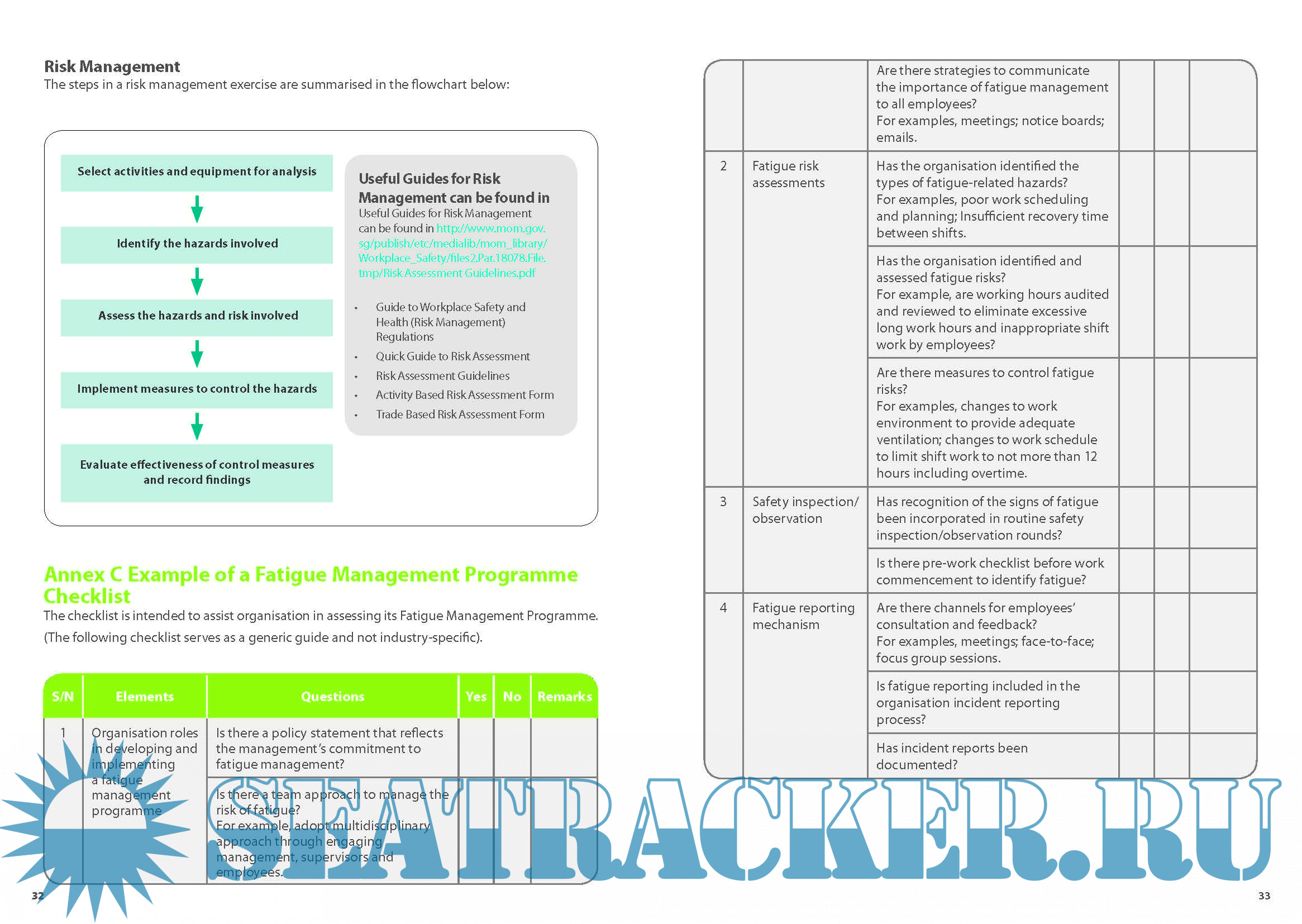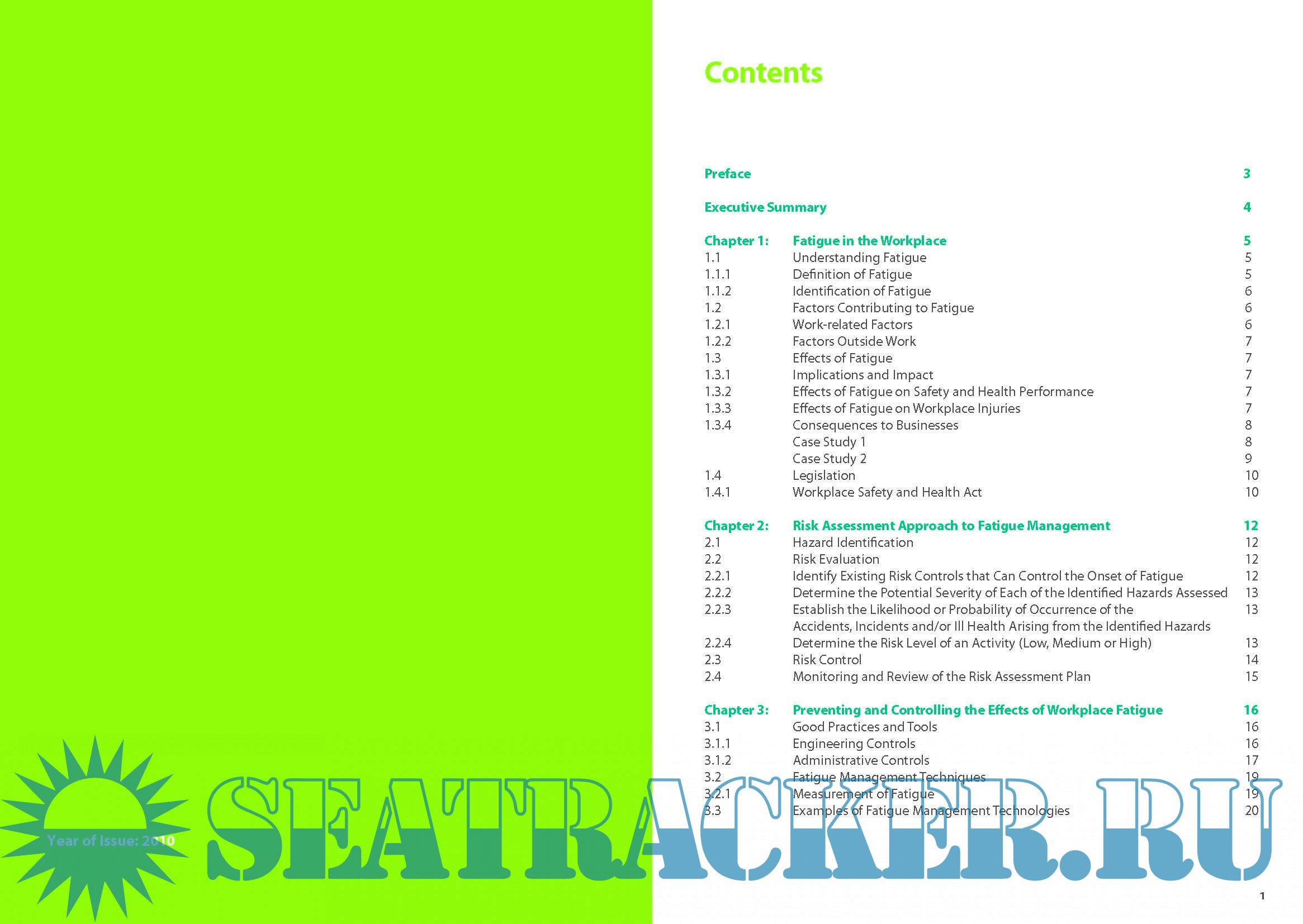 Year: 2010 Language: english Author: Workplace Safety and Health Council Genre: Guide Format: PDF Quality: eBook Pages count: 21 Description: Fatigue is a state of tiredness leading to reduced mental and/or physical performance that can endanger workplace safety. The onset of fatigue while at work can decrease a person’s alertness and compromise his or her motor skills, reflex ability, judgement and decision-making. All these have obvious implications for workplace safety and health. Inordinately long working hours and poorly planned shift work can result in employee fatigue. Specifically, inappropriate and/or ineffective management of work schedules can lead to quick onset of fatigue. Fatigue amongst employees can lead to workplace accidents and near-miss incidents arising from reduced alertness and concentration. Thus, factors contributing to the onset of fatigue must be addressed. Elements contributing to fatigue comprise: • Organisational factors, e.g. the lack of a fatigue management policy to manage factors contributing to fatigue such as: - Unexpected increase in workload; - Lack of equipment; - Lack of manpower; and - Nature of work. • Environmental factors, e.g. lighting and temperature. • Individual factors, e.g. state of individual health and life style as well as social factors. Although it is difficult to totally eliminate long working hours and night shift work, having a fatigue management policy and plan can help to eliminate or control adverse impact on workplace safety and health performance. Currently, there are no national standards on fatigue management. This general guideline on fatigue management is developed to provide guidance to assist industries in managing fatigue from the safety and health perspective. It includes recommended measures to avoid long work hours and manage shift work effectively to prevent the onset of fatigue in the workplace. This guideline serves to: a) Raise awareness of workplace safety and health hazards and risks associated with fatigue; b) Provide guidance on the recommended measures and practices to manage fatigue in the workplace; and c) Establish guidelines for maintaining optimal work performance through a healthy lifestyle.