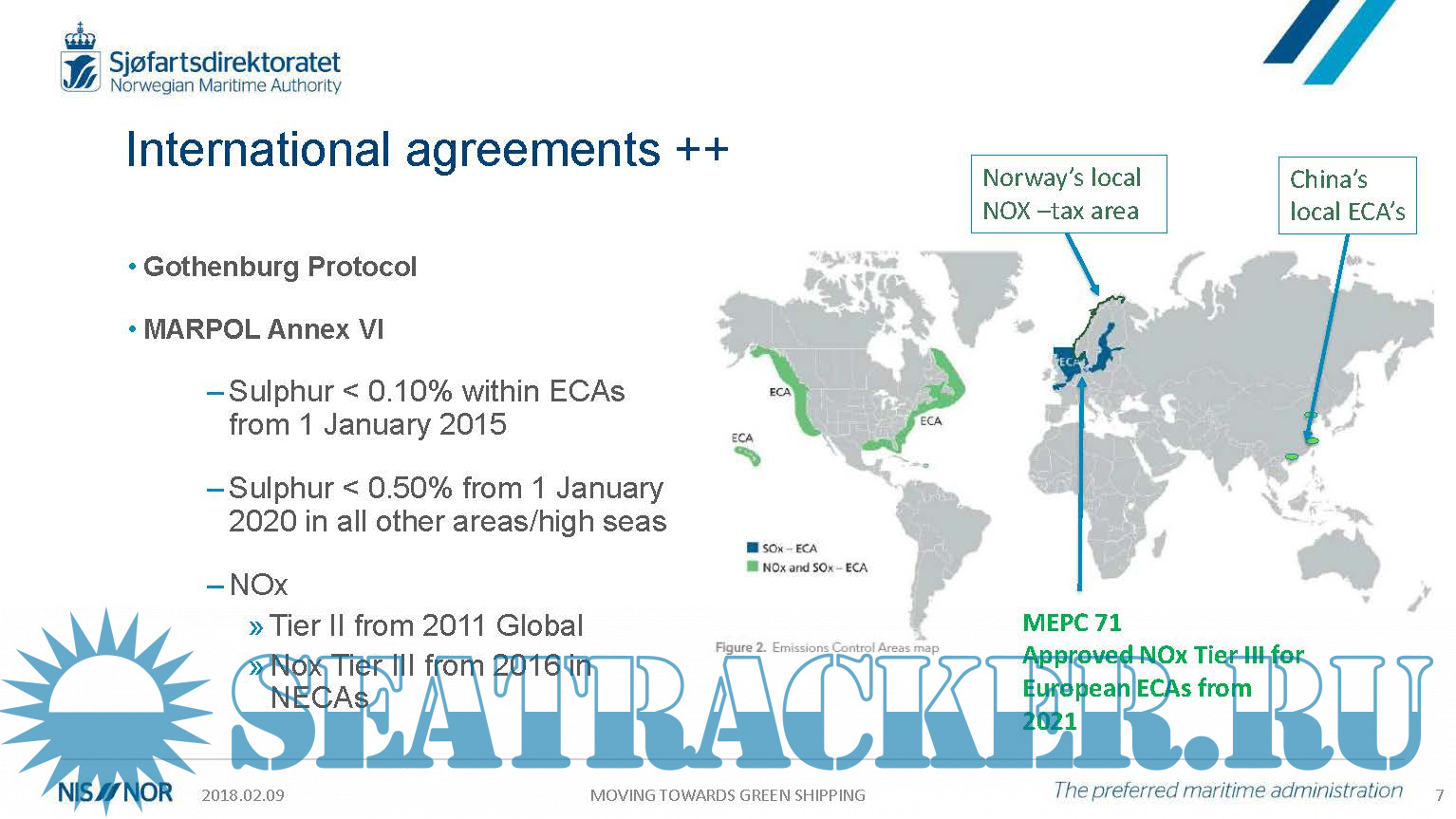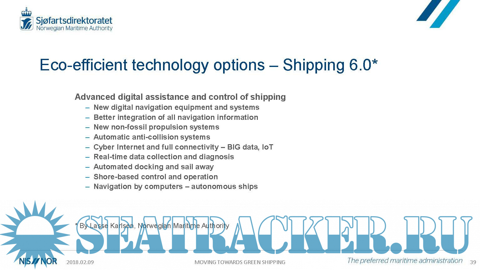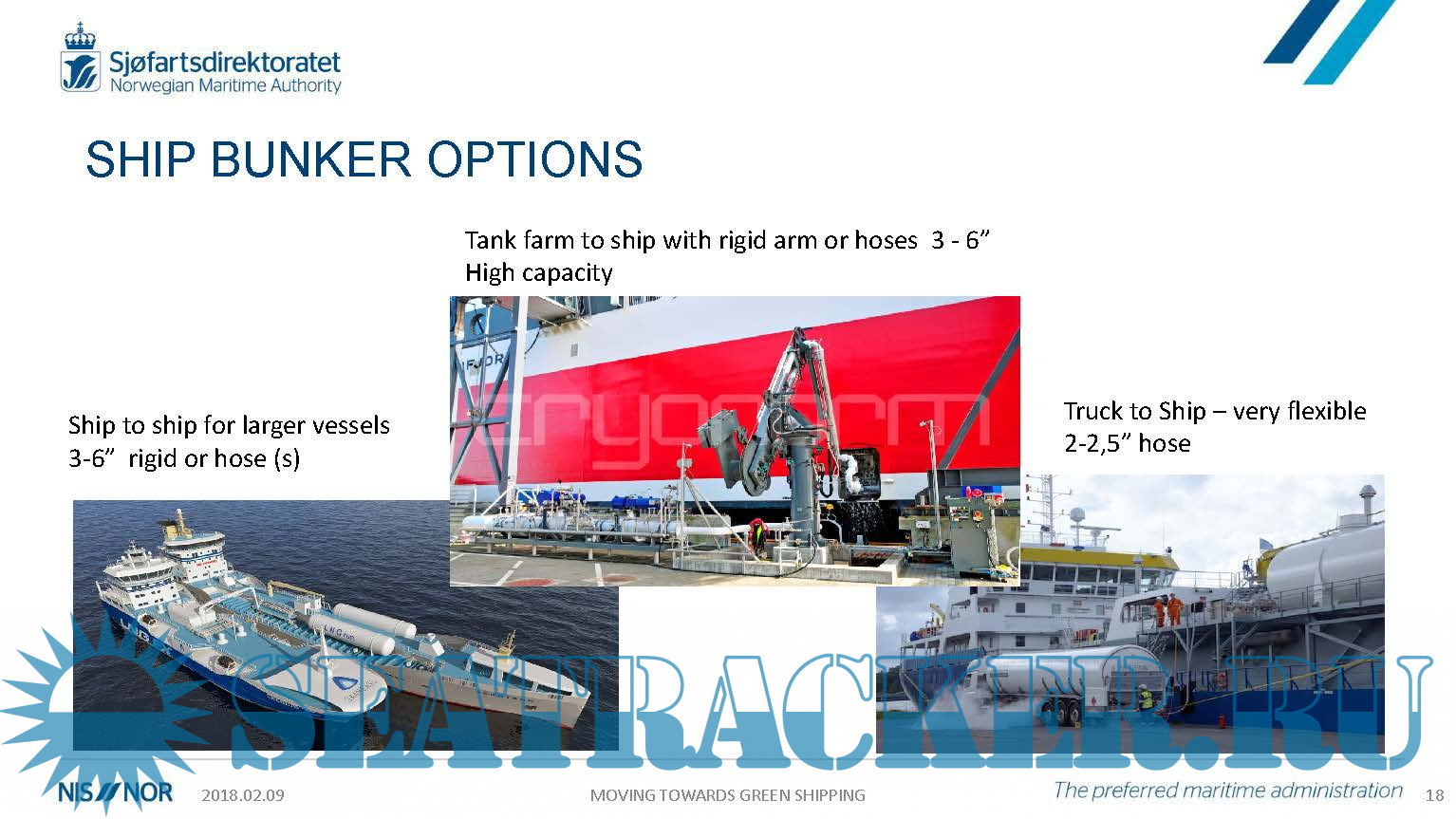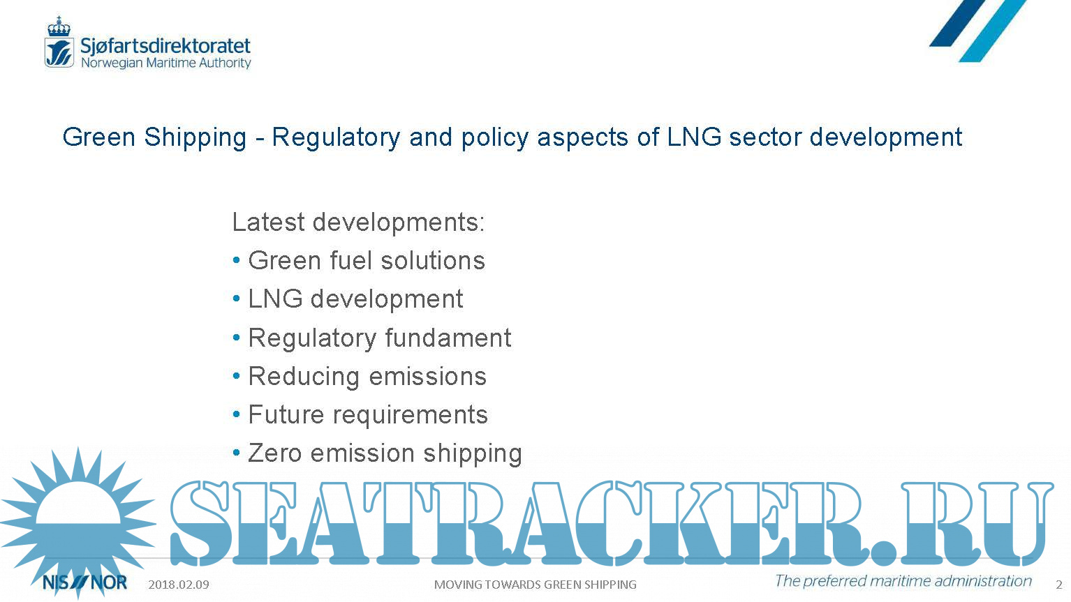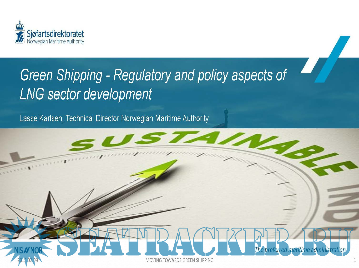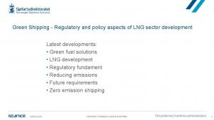 Description: The Green Shipping - Regulatory and policy aspects of LNG sector development is a presentation prepared by the Norwegian Maritime Authority advising the latest developments and future trends and invites Owners to build Green fuelled ships.