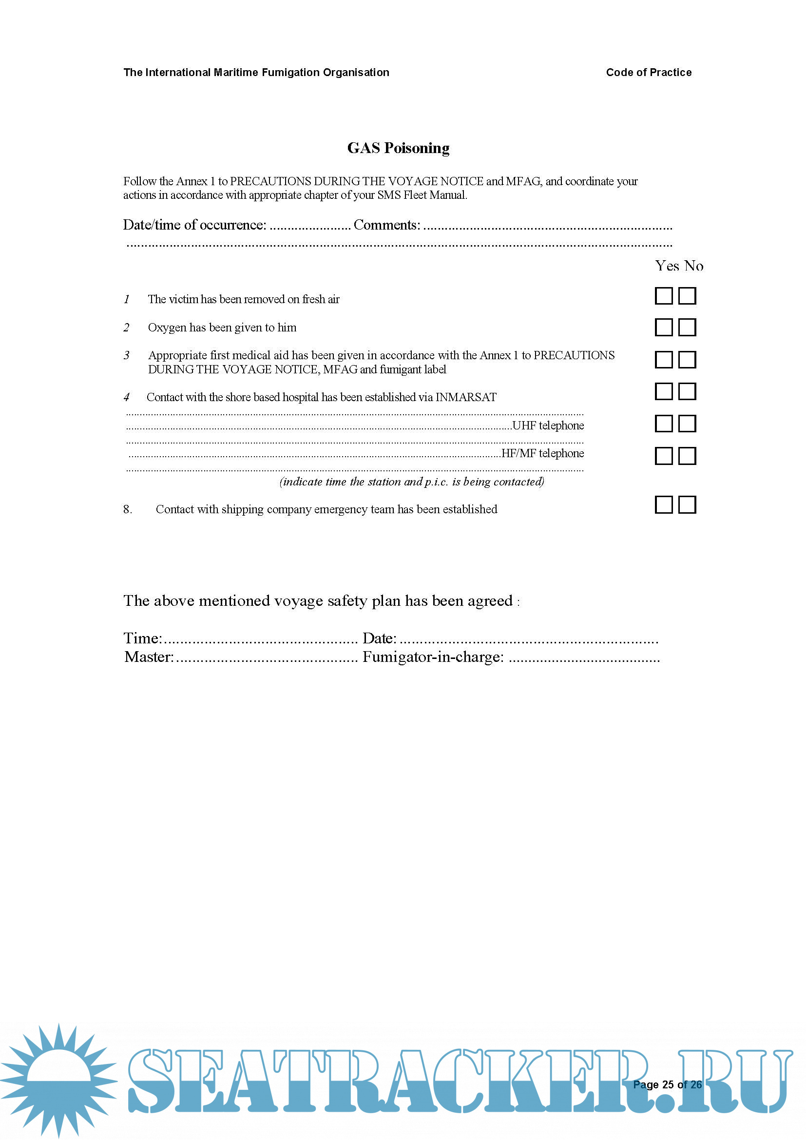 Description: The main purpose of marine fumigation (or fumigation in ship's holdscontinued in transit) is to prevent from idle time of ships under fumigation inport. Marine fumigation became possible with introduction of Phosphine (orHydrogen Phosphide) - the only fumigant used for this purpose nowadaysaccording to IMO Recommendations on the Safe Use of Pesticides in Ships. Theprocess of marine fumigation begins with fumigant application to the cargo atload port, continues with fumigant exposure during voyage and ends withdegassing and fumigation efficacy control at discharge port. To provide formaximum safety and achieve the targeted efficiency for this complicated processthe cooperation of all parties involved is essential: traders, fumigators, mariners,stevedores, etc. With the aim to increase the standards of marine fumigation, toimprove cooperation between all parties concerned and to provide forcomprehensive and guaranteed treatment the International Maritime FumigationOrganisation (IMFO) was founded.