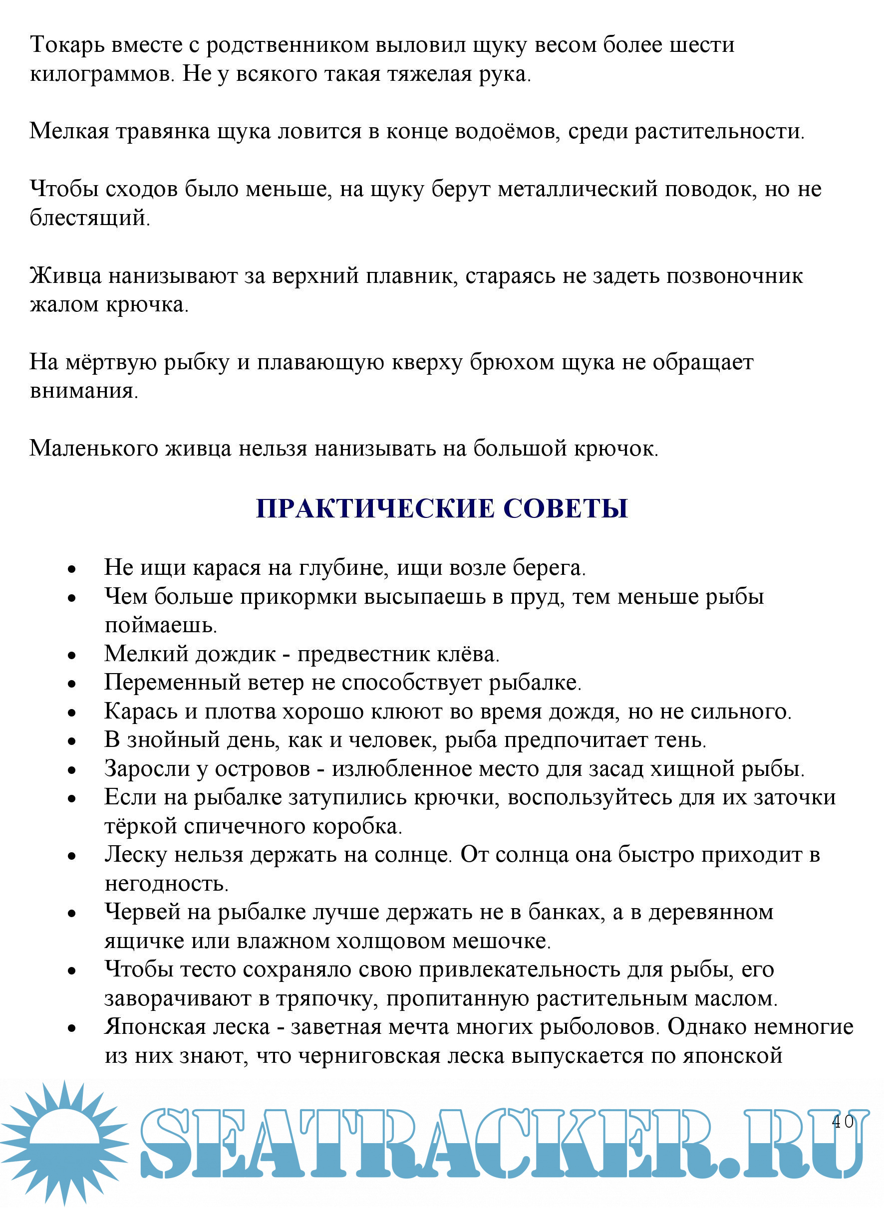 Морская рыбалка. Бычок - постоянный трофей рыболовов. Сарган - рыба-стрела. Ставрида - темноглазая красавица. Барабуля. Когда цветёт акация. Кефаль - заветная, как мечта. Черноморская акула - катран. Ловля акулы с берега. Зеленушка - рыба-радуга. Пикша - мелочь тоже рыба. Пеленгас - краснопёрая кефаль. Камбала глосса. Советы. В тиши приморских водоёмов. Серебряный карась. Окунь. Морская душа. Плотва. Серебряное ожерелье. Карп - неукротимый соперник. Судак. О чем судачат судаки? Щука с руку. Советы.