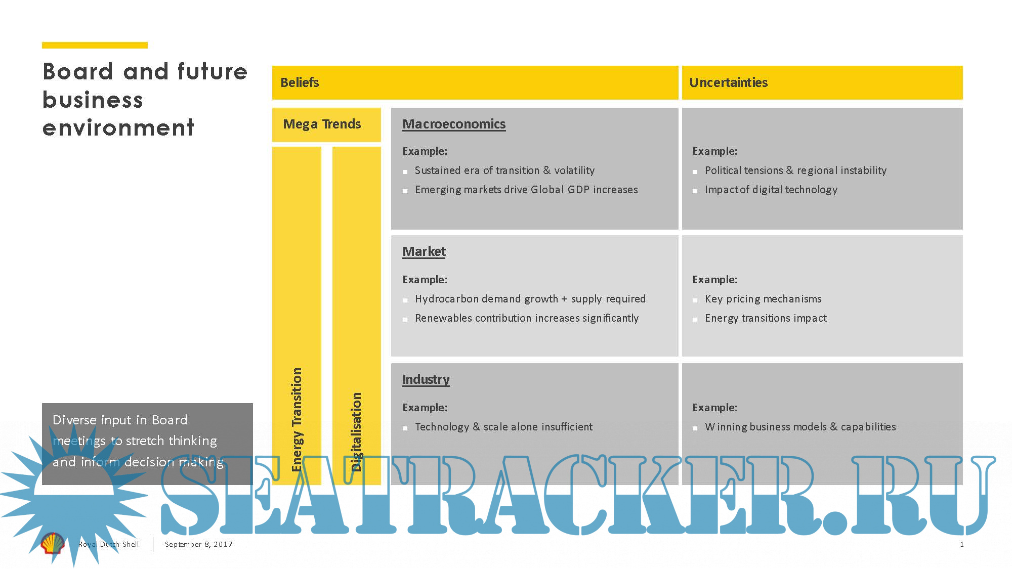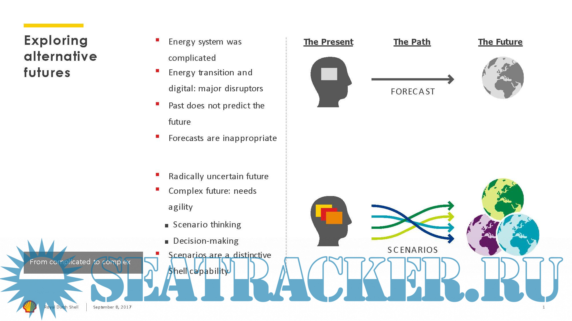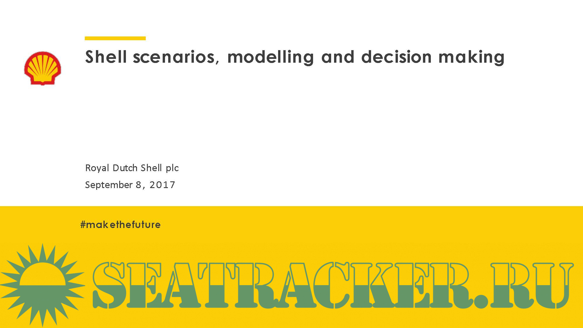 Year: 2017 Language: english Author: Royal Dutch Shell plc Genre: Presentation Format: PDF Quality: eBook Pages count: 39 Description: This presentation contains data from Shell’s New Lens Scenarios. The New Lens Scenarios are a part of an ongoing process used in Shell for 40 years to challenge executives’ perspectives on the future business environment. We base them on plausible assumptions and quantifications, and they are designed to stretch management to consider even events that may only be remotely possible. Scenarios, therefore, are not intended to be predictions of likely future events or outcomes and investors should not rely on them when making an investment decision with regard to Royal Dutch Shell plc securities.