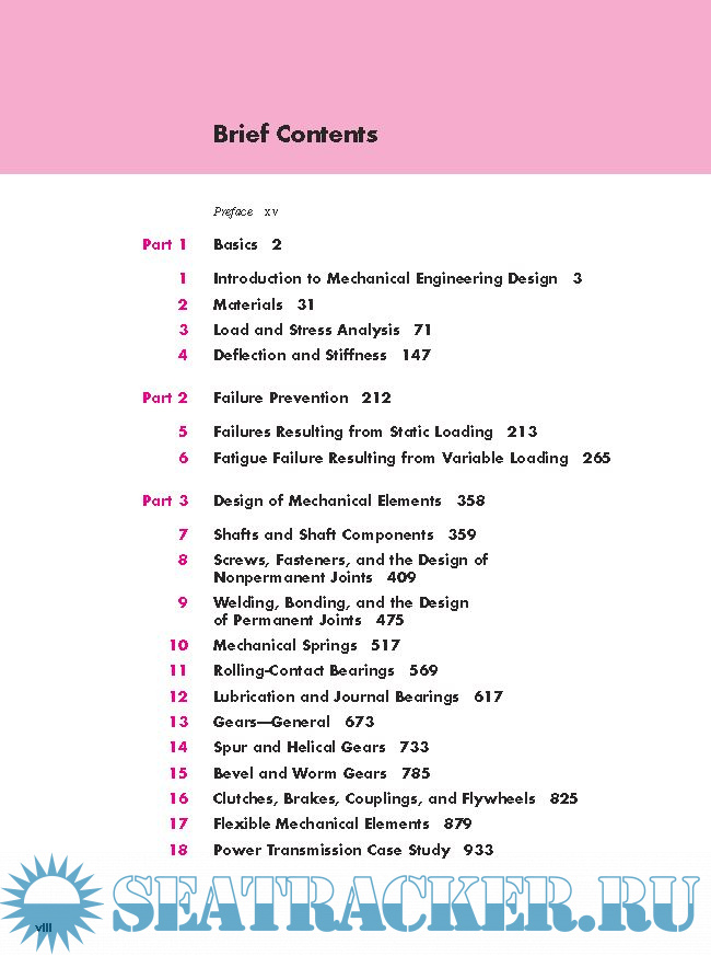 Year: 2011 Language: english Author: Richard G. Budynas & J. Keith Nisbett Genre: Textbook Publisher: McGraw-Hill Edition: 9th ISBN: 978–0–07–352928–8 Format: PDF Quality: eBook Pages count: 1109 Description: This text is intended for students beginning the study of mechanical engineering design. The focus is on blending fundamental development of concepts with practical specification of components. Students of this text should find that it inherently directs them into familiarity with both the basis for decisions and the standards of industrial components. For this reason, as students transition to practicing engineers, they will find that this text is indispensable as a reference text. The objectives of the text are to: • Cover the basics of machine design, including the design process, engineering mechanics and materials, failure prevention under static and variable loading, and characteristics of the principal types of mechanical elements • Offer a practical approach to the subject through a wide range of real-world applications and examples • Encourage readers to link design and analysis • Encourage readers to link fundamental concepts with practical component specification
