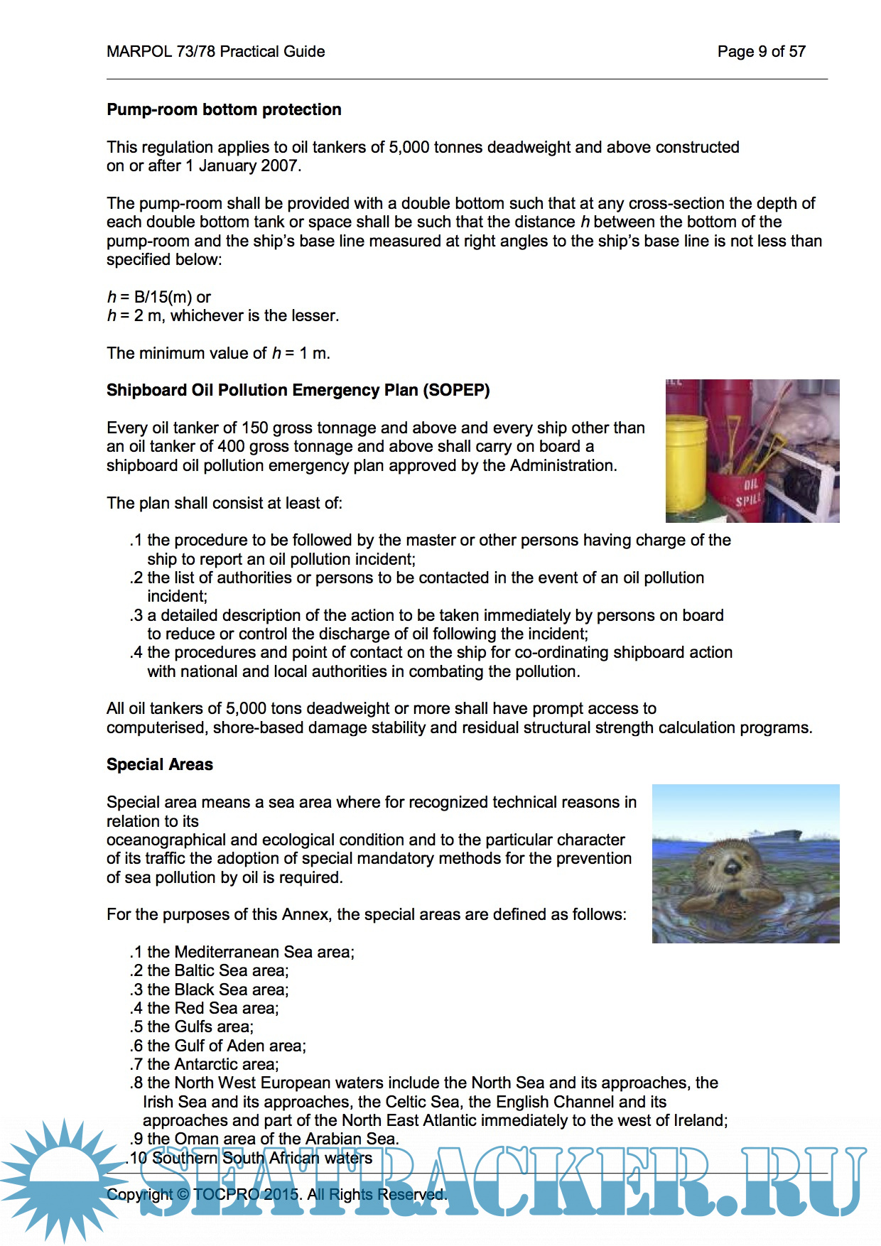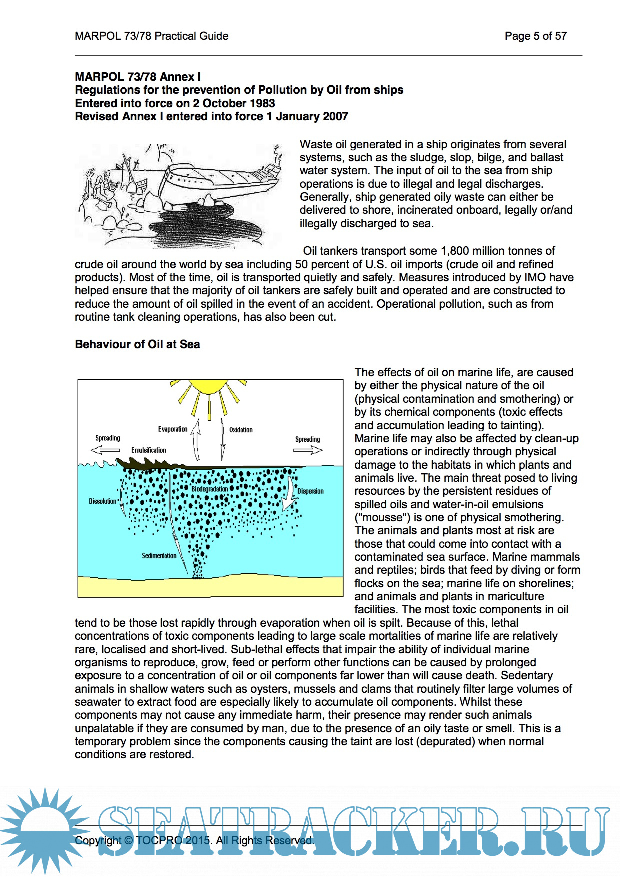 Year: 2015 Language: english Author: TOCPRO Genre: Guide Publisher: TOCPRO Format: PDF Quality: eBook Pages count: 57 Description: MARPOL 73/78 Practical Guide The MARPOL Convention is the main international convention covering prevention of pollution of the marine environment by ships from operational or accidental causes. It is a combination of two treaties adopted in 1973 and 1978 respectively and updated by amendments through the years. The International Convention for the Prevention of Pollution from Ships (MARPOL) was adopted on 2 November 1973 at IMO and covered pollution by oil, chemicals and harmful substances in packaged form, sewage and garbage. The Protocol of 1978 relating to the 1973 International Convention for the Prevention of Pollution from Ships (1978 MARPOL Protocol) was adopted at a Conference on Tanker Safety and Pollution Prevention in February 1978 held in response to a spate of tanker accidents in 1976-1977. (Measures relating to tanker design and operation were also incorporated into a Protocol of 1978 relating to the 1974 Convention on the Safety of Life at Sea, 1974). The Convention includes regulations aimed at preventing and minimizing pollution from ships - both accidental pollution and that from routine operations - and currently includes six technical Annexes. Special Areas with strict controls on operational discharges are included in most Annexes.