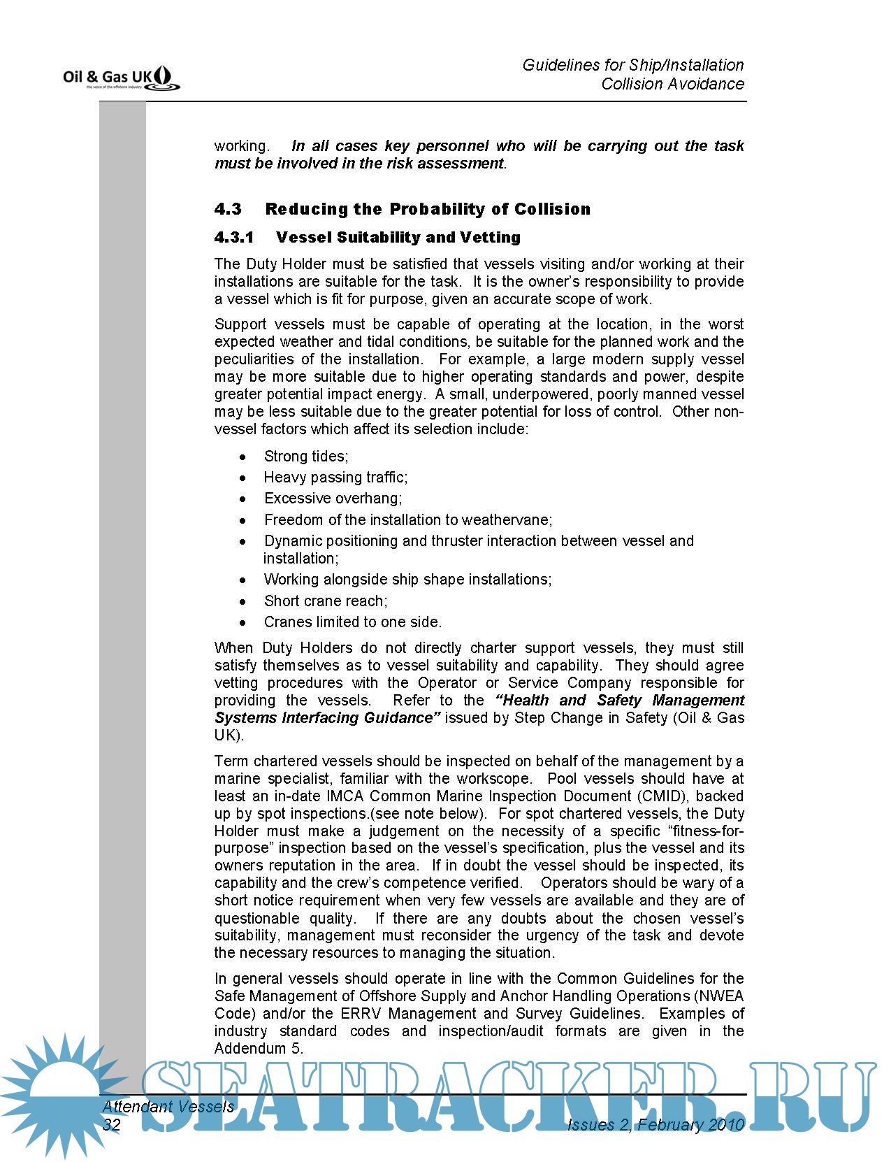 Consequences are only considered insofar as they dictate timely appropriate response to imminent or actual impact. It gives guidance on good practice and suggests benchmarks against which to assess compliance. ALARP principles apply. Although procedures and equipment are suggested it is recognised that suitable alternatives for the situation of a particular field or installation may be acceptable. The document emphasises that equipment to achieve effective collision avoidance is safety critical and should be maintained as such.