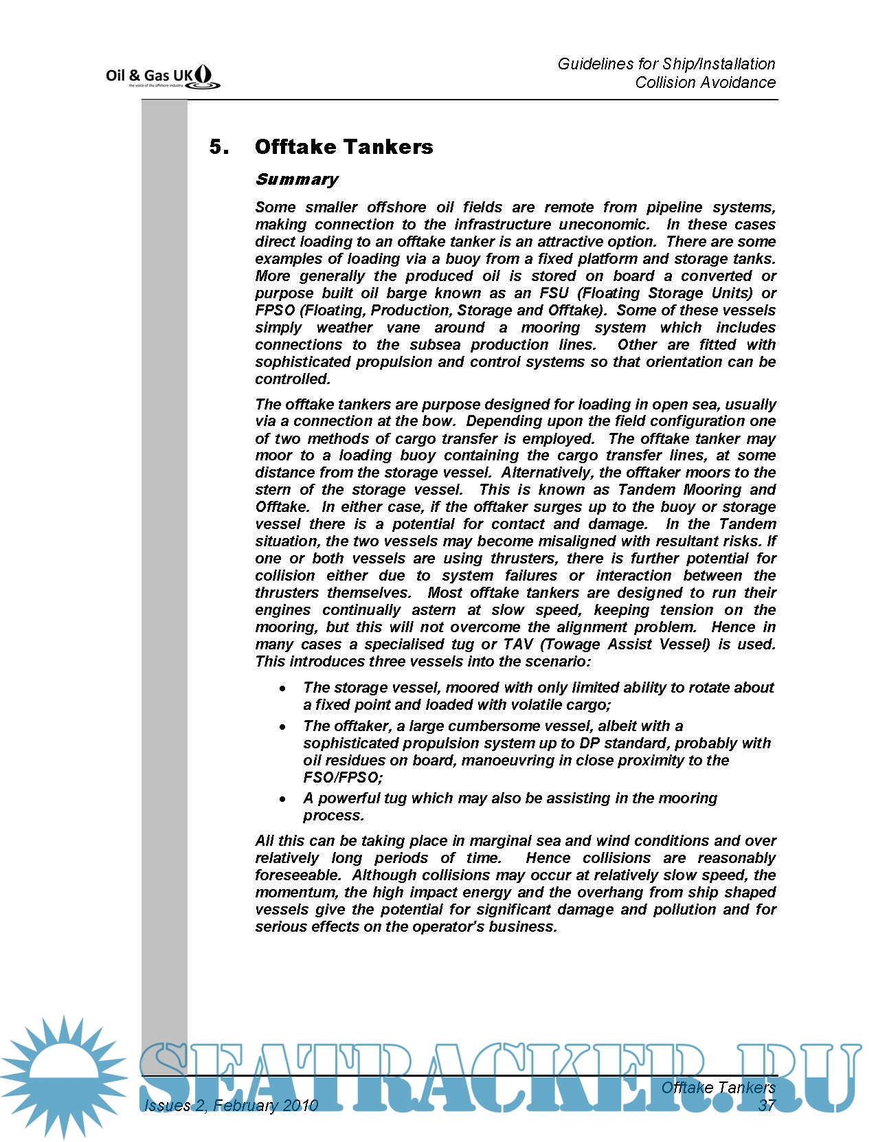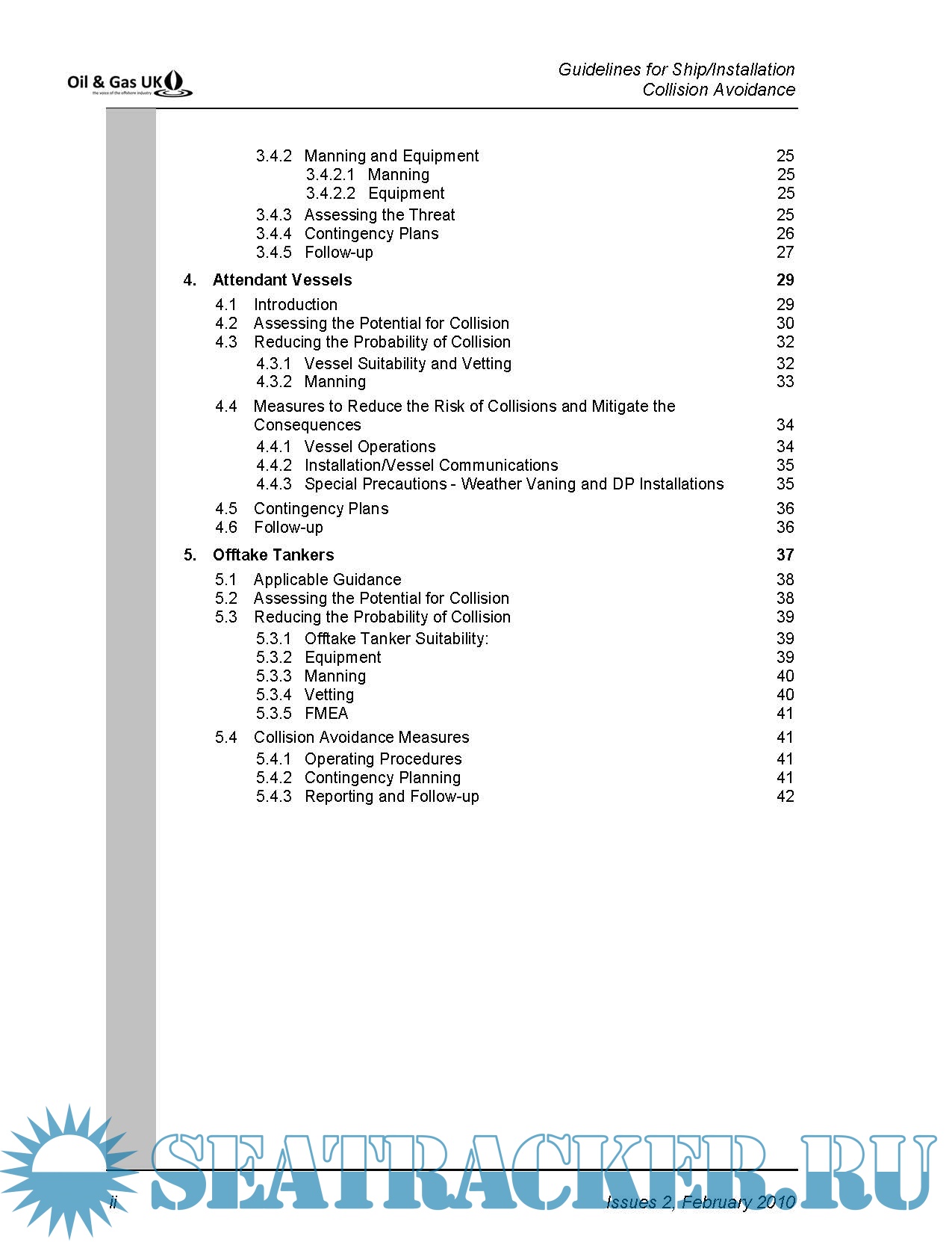 Year: 2010 Language: english Author: Oil & Gas UK Genre: Guide Publisher: Oil & Gas UK ISBN: 1 903 003 62 8 Format: PDF Quality: eBook Pages count: 83 Description: This document focuses on the reducing the risk of ship-installation collisions. Consequences are only considered insofar as they dictate timely appropriate response to imminent or actual impact. It gives guidance on good practice and suggests benchmarks against which to assess compliance. ALARP principles apply. Although procedures and equipment are suggested it is recognised that suitable alternatives for the situation of a particular field or installation may be acceptable. The document emphasises that equipment to achieve effective collision avoidance is safety critical and should be maintained as such. For the purposes of this document various vessel types are considered separately: passing vessels - those on route to somewhere else; attendant vessels - that is vessels with legitimate business at the installation; offtake tankers - a subset of attendant vessels, which interact with the installation in a specialised way and are therefore addressed in a dedicated section. Recommendations made in this guidance rely principally on checklists covering management systems, vessel suitability, self-audit and pre-operational checks – a form of risk assessment. They draw, wherever possible, on existing proven industry standards. The guidance is aimed principally at operations in the UK Sector, and hence refers to UK legislation, practices and organisations. Other administrations and national associations may wish to use its principles in their own Sectors.