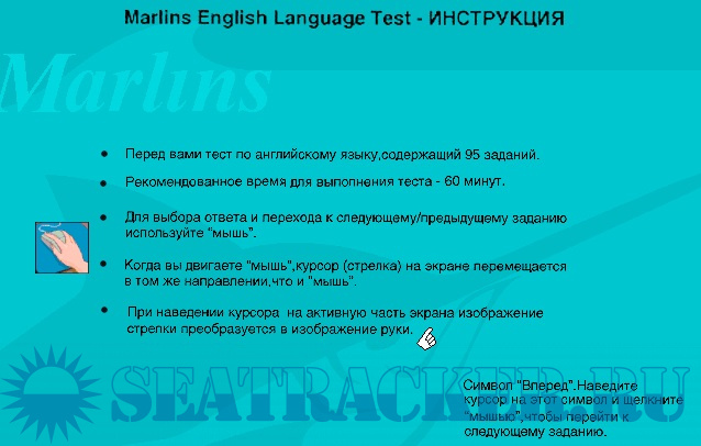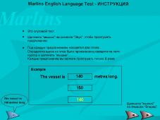 Год выпуска: 1999 Версия: 1.0 Разработчик: Sanderson SCBT Limited Платформа: Windows Совместимость с 64-битными ОС: нет Системные требования: Windows XP 32bit Язык интерфейса: Русский, Английский Таблэтка: Не требуется Описание: 1. Для установки программы запустите setup с диска. 2. После завершения программы установки запустите из меню "ПУСК->ПРОГРАММЫ->Marlins Test" Marlins Test. 3. Для просмотра результатов теста запустите из того же меню Marlins Administration. Данная программа установливается только на диск C: в папку SCBT (C:\SCBT\). Тест на знание английского языка для плавсостава. Количество запусков не ограничено. Программа широко используется иногда в крюнинговых компаниях. Если вам не нужна аттестация плавсостава по специальностям на английском языке, а только проверка грамматики английского языка для плавсостава, то эта программа для Вас. Какие-либо картинки к вопросам отсутствуют. Просмотреть правильные или неправильные ответы невозможно. Можно только увидеть общий результат теста в %, по таким параметрам в % как: Listening , Reading , General. Требования в Компаниях - не менее 65% общий результат прохождения аттестации. Но в Лондонском "Зодиаке" не менее 90%. тестирование проводится в "обучающем" (когда пользователю автоматически предлагается правильный ответ) и "экзаменационном" режимах. Результаты тестирования фиксируются в виде отчетов, которые далее предлагается распечатать на принтере. На основании полученных результатов программа дает рекомендации по изучению того или иного раздела Marlins Progress Test. отличное пособие для самопроверки.