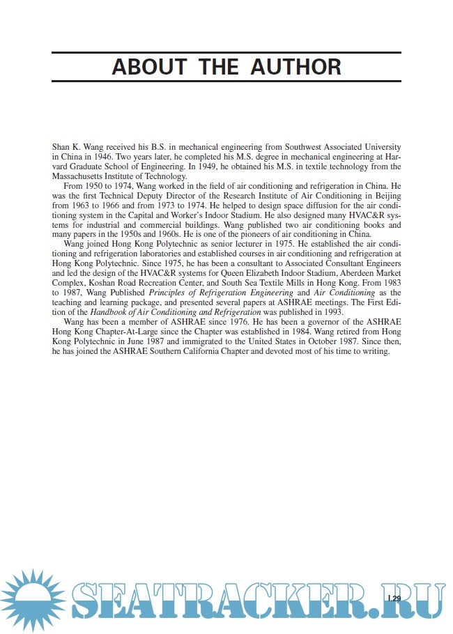 Shan K. Wang received his B.S. in mechanical engineering from Southwest Associated University in China in 1946. Two years later, he completed his M.S. degree in mechanical engineering at Harvard Graduate School of Engineering. In 1949, he obtained his M.S. in textile technology from the Massachusetts Institute of Technology. From 1950 to 1974, Wang worked in the field of air conditioning and refrigeration in China. He was the first Technical Deputy Director of the Research Institute of Air Conditioning in Beijing