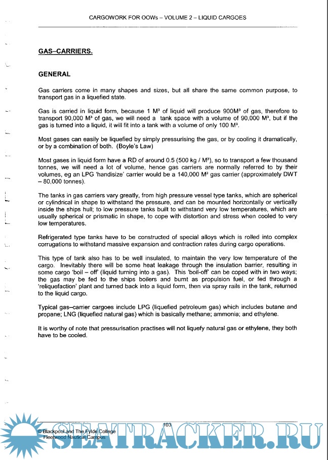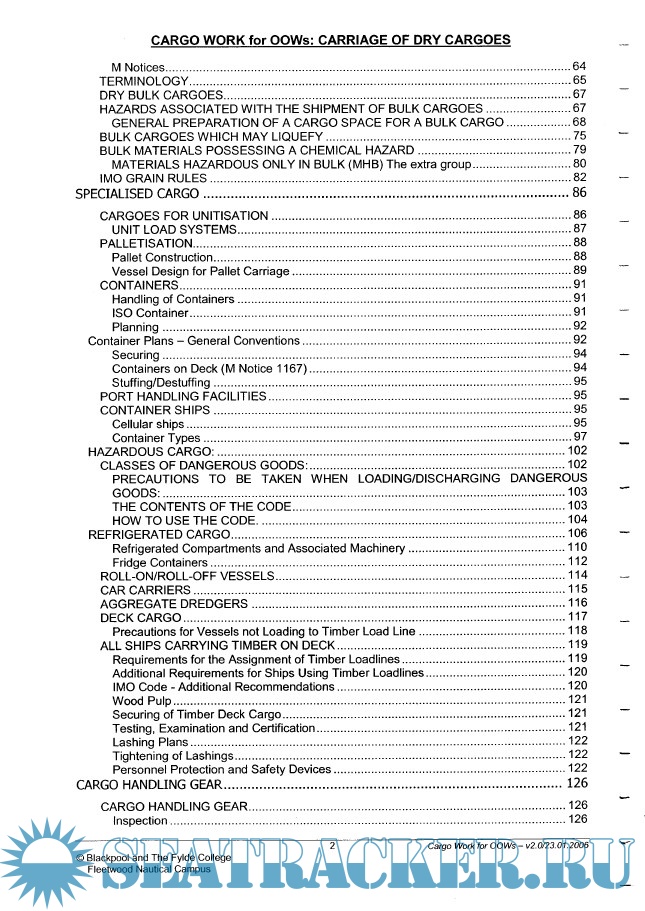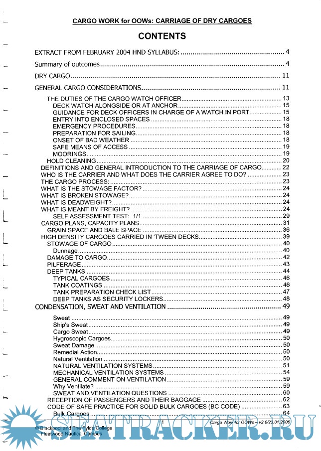 Year: 2006 Language: english Author: Blackpool and The Fylde College Fleetwood Nautical Campus Genre: Training courses Publisher: Blackpool and The Fylde College Fleetwood Nautical Campus Edition: v. 2.0 Format: PDF Quality: OCR with errors Pages count: 303 Description: Unit 4 : Cargo Work This unit introduces the learner to conducting a deck watch as a cargo officer. It involves the principle and safe working practice for monitoring the loading, stowage, securing and unloading of dry cargo and gas, liquid and chemical cargoes and their care during the voyage. It is primarily aimed at learners who intend to seek sea-going employment as a Merchant Navy Deck Officer. Contains 3 files: Carriage of Dry Cargoes & Volume 2: Carriage of Liquid Cargoes (Oil and Gas)