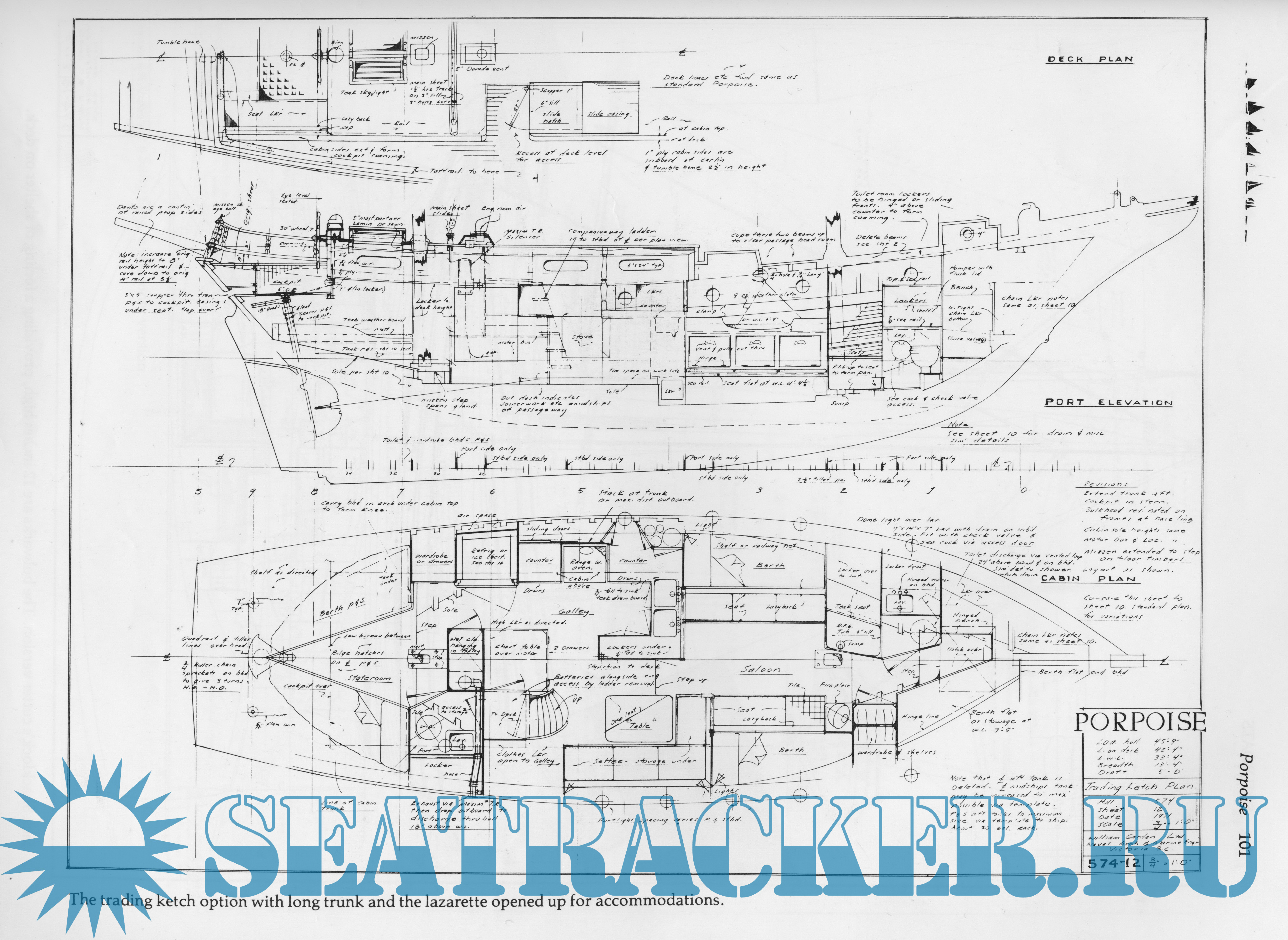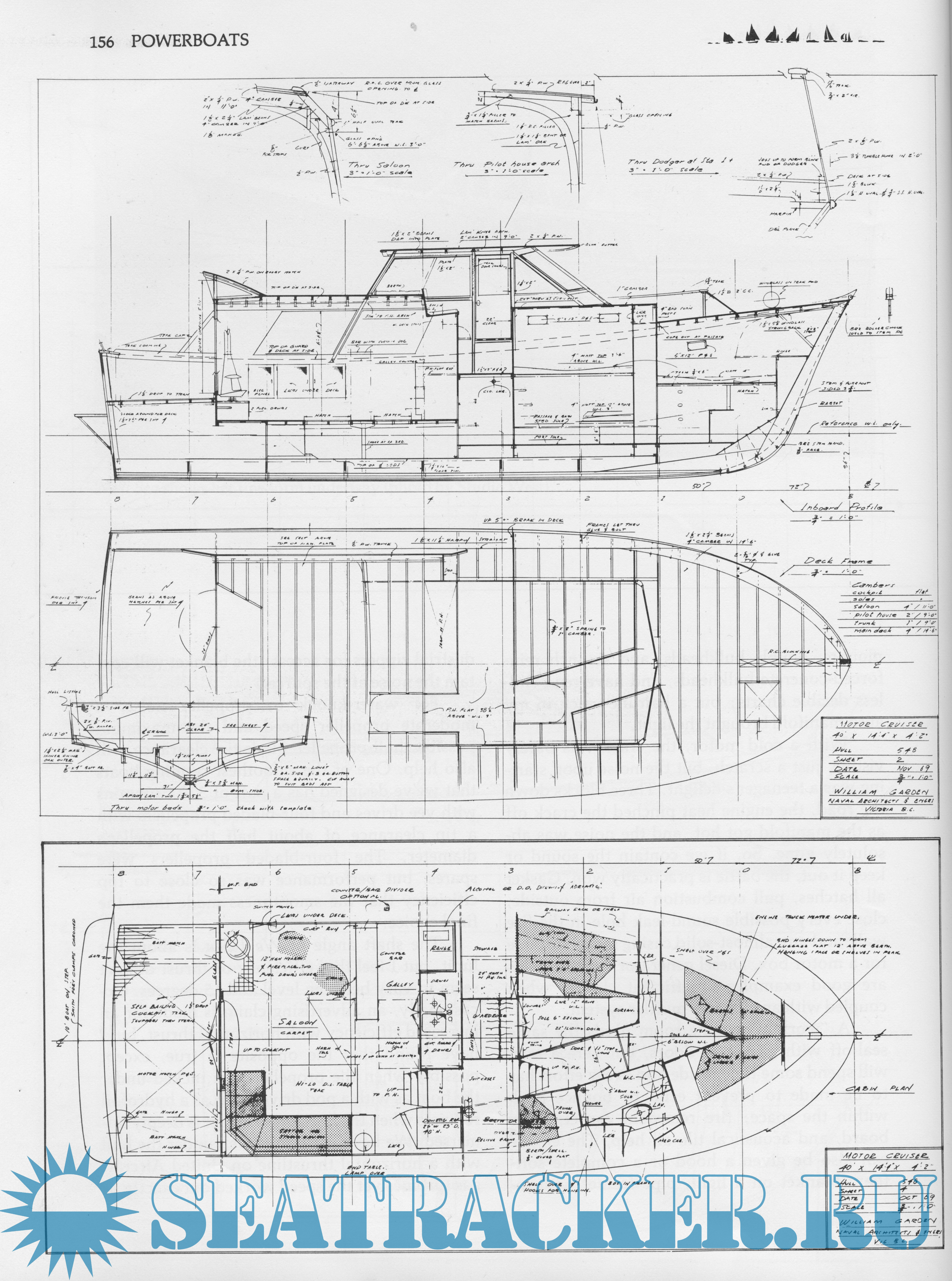 Additional info: William Garden was born in 1918. He attended the Edison Boatbuilding School in Seattle and then went to work for Andrew’s Boat Company for several years before forming his own company in 1940. Drafted by the US Army during World War II, Garden was posted at the Adak Ship Repair Base in the Aleutian Islands. Discharged in spring 1946, Garden became a licensed Naval Architect a year and a half later. His design business continued to grow, and in 1968 he relocated to an island in British Columbia. His early work consisted of mainly fishing boats — seiners, gillnet boats, halibut boats, and trollers — while his later work primarily involves yacht designs. He contributed articles and designs to Rudder, Yachting, Wooden Boat and other maritime publications, and he wrote several books about his designs, including “100 Yacht and Vessel Designs: From the Board of William Garden,” circa 1971, “Yacht Designs,” 1977, “Yacht Designs II,” 1992 and “Yacht Designs: Revised and Expanded.”