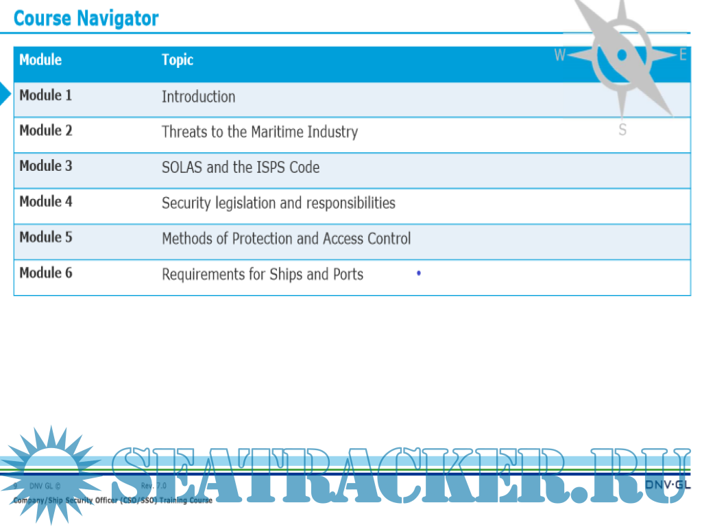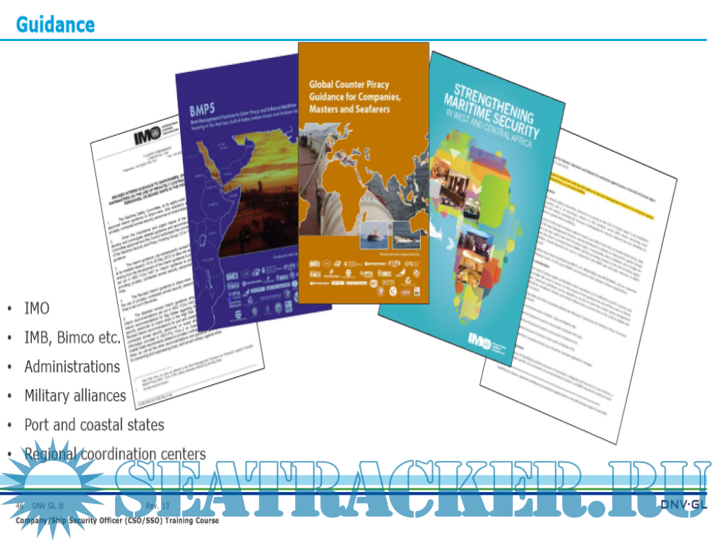 Year: 2019 Language: english Author: DNV-GL Maritime Academy Genre: Training courses Publisher: DNV-GL Maritime Academy Edition: Rev 7.0 Format: PDF Quality: eBook Pages count: 310 Description: The course provides participants with the knowledge, understanding, and proficiencies as required by STCW 78, as amended and the ISPS Code to undertake the tasks, duties, and responsibilities as Company Security Officer (CSO) or Ship Security Officer (SSO). Practical case studies, exercises, and videos are used to illustrate possible measures to comply with the maritime security requirements as laid down in the ISPS Code. Achievement of competencies is assessed by means of a final test. Company Security Officer (CSO) in accordance with the standard of competence as outlined in the Guidelines on Training and Certification for Company Security Officers issued as Annex of MSC/Circ.1154 and the IMO Model Course 3.20; Ship Security Officer (SSO) in accordance with the Mandatory Minimum Requirements for the Issue of Certificates of Proficiency for Ship Security Officers, set out in section A-VI/5, paragraphs 1 to 4 of the STCW 78, as amended and the IMO Model Course 3.19. Note: Our course is accepted by relevant flag states but not by the British Maritime and Coastguard Agency (MCA). For MCA approved SSO or CSO training, please contact your closest Maritime Academy office. The Training Certificate is recognized by major flag States as a precondition for the issuance of a Certificate of Proficiency (CoP) as Ship Security Officer Additional info: Objectives Training for qualification as Company Security Officer (CSO) and Ship Security Officer (SSO)