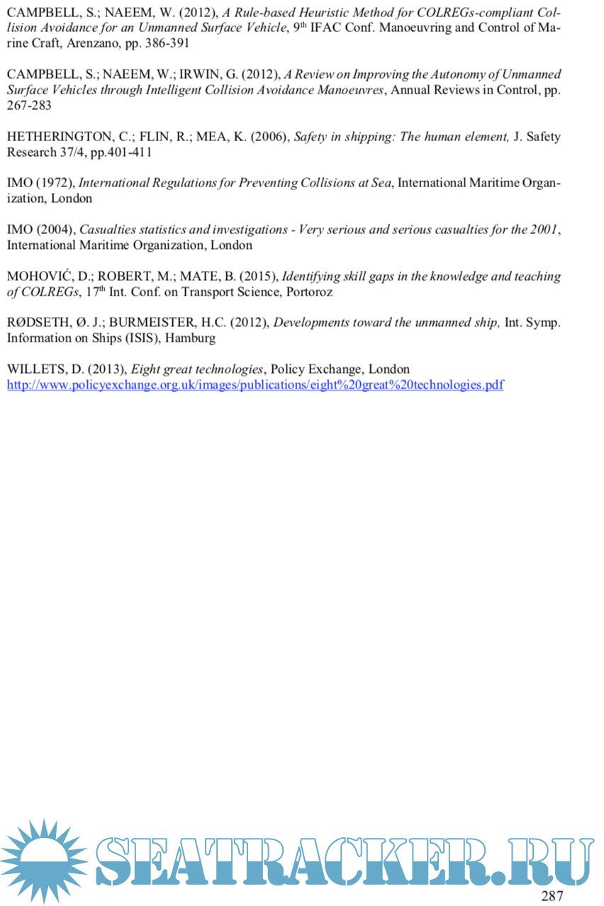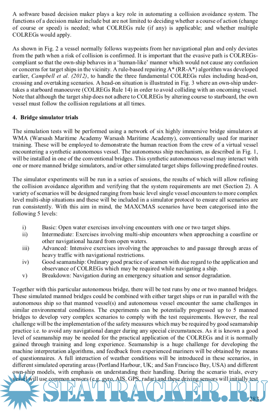 Year: 2014 Language: english Author: Jesus Mediavilla Varas Genre: Research papers Format: PDF Quality: eBook Pages count: 8 Description: This paper presents an approach to COLREGs compliant ship navigation. A system architecture is proposed, which will be implemented and tested on two platforms: networked bridge simulators and at sea trials using an autonomous unmanned surface vessel. Attention is paid to collision avoidance software and its risk mitigation.