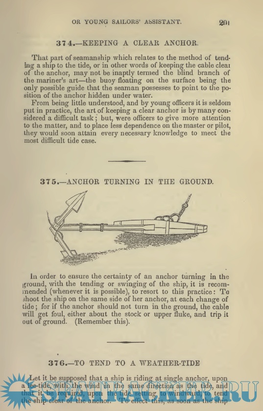 The book was written for the use of the Naval and Merchant Service of the United States, as a ready to hand manual, and first published in the mid-19th century. It soon became the Bible of U.S. sailors and had many reprints and revisions. It provides specific instructions for every aspect of sailing the great ships, from knotting and rigging to blacking the guns, from stationing the crew to dealing with emergencies. The sailor learns about stowing provisions, driving before the wind, securing the ship for sea, and setting and shifting course. He also learns what to do in the extremities of life at sea: how to unbend a topsail in a gate and how to prepare for a hurricane; what to do if the tiller breaks, the mainmast is carried away, or the ship leaks faster than the pumps can free her.