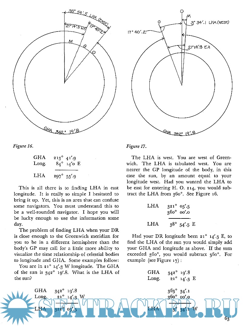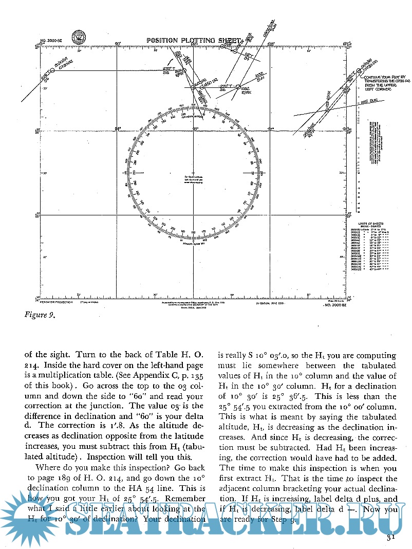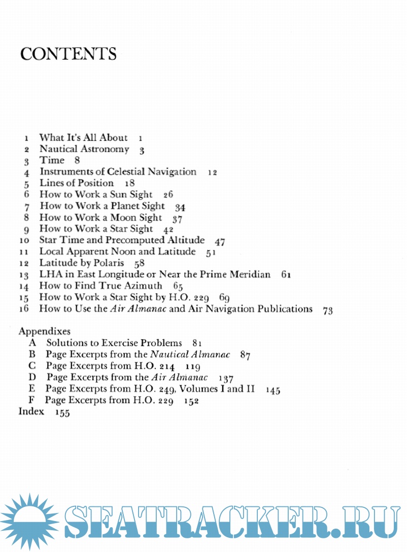 The first five chapters explain the meaning of the terms used in navigation, and explain the concepts behind the practical side of modern marine navigation. Chapters 6 through 16 are "how to" lessons. The student should study these chapters with contious reference to the appendix and the excerpts from the sight reduction tables and almanacs printed there. Each step can be repeated until he feels he has mastered the chapter. In each chapter, the steps are outlined with a detailed narrative explanation of what is involved. The same problem or a similar problem is worked again using the format that would be used in actual practice. Exercise problems are then provided.
