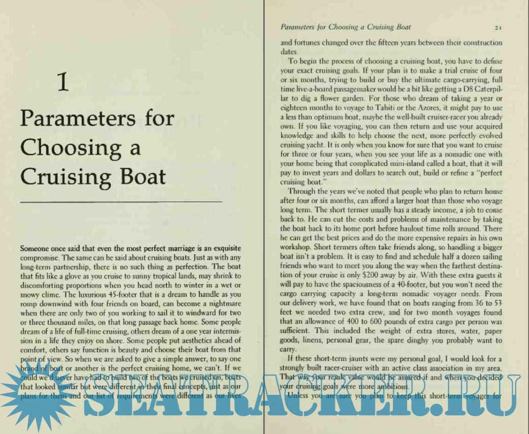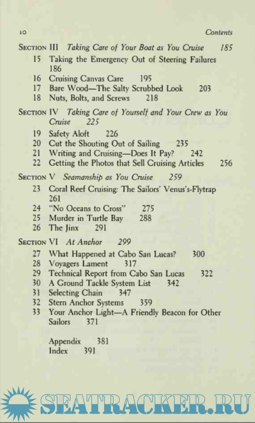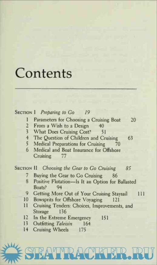 Year: 1987 Language: english Author: Lin and Larry Pardey Genre: Handbook Publisher: W.W. Norton & Company Edition: Second ISBN: 0-393-03321-X Format: PDF Quality: Scanned pages Pages count: 407 Description: This professionalism characterizes the Pardey’s how-to writing, and fills the reader with a justified confidence that I have never felt in the work of writers who merely compile and repeat conventional wisdom, much of it ultimately serving the advertisers in marine publications. The authors’ subject matter is fresh, specific, and original, and they don’t seem to pad their writing with material that is not based on their own experience, unlike some who want to believe they have covered their subject in its entirety—an impossibility in the world of boats! The Pardeys are not extremists. Minimalism and simplification are tools they use to create positive experiences, freedom, and flexibility in their plans. When it’s time to splurge a little, they do, but they get a lot out of it. Even wealthy yachtsmen would do well to read everything the Pardeys write before they go off voyaging, for, while they might have the ability to solve many problems with the wave of a checkbook they cannot re-create time that is lost to needless repairs or long waits for parts, or to frustration over the failure of systems they have not considered how to live without. The Capable Cruiser is in some ways all about this philosophy, but primarily it is an anthology of succinct and specific articles about practical subjects. Those who seek cruising stories should look to the Pardey’s excellent accounts of some of their cruises. The first section, “Preparing to Go” covers choosing a boat, cruising costs, children, medical preparations, and insurance. There is some overlap with The Cost Conscious Cruiser, which expands on some of these subjects, but much of it does stand alone. The second section is all about gear, and discusses a number of subjects that I have not previously seen addressed in print. Among the chapters is one about positive flotation, with an emphasis on emergency flotation of heavier cruising boats through the use of inflatable bladders. At the time of writing the authors had not installed such a system despite thorough study. It is a shame that this excellent idea has not, as far as I know, seen much development over the several years since this book was written. As the Pardeys point out, it would a fairly complicated product to develop and market, with a very small potential customer base, so there is little incentive for capital to gravitate toward the idea. Maybe someone else will take it up, perhaps with the emphasis on owner-designed and –built systems made of already-available components. I could think of worse places for some government grant money to go. The book’s involved discussion about flotation for heavy displacement vessels should not hide the important points made in its briefer treatment of light displacement vessels. The lighter a yacht’s displacement, the less flotation is needed to support her in an emergency, and therefore, the more practical that flotation becomes. In lighter boats the emphasis swings from bladders inflated in an emergency toward permanently-installed foam, an inherently simple, low-cost, and reliable solution. I have had two small, light-displacement cruising sailboats with foam flotation, and the storage space lost to it was insignificant, particularly when compared to the peace of mind that was gained. I might not pick a light displacement boat for offshore voyaging due to its more tiring motion, but this ability to easily achieve “unsinkability” is one of the strongest arguments for the type. Certainly this option should weigh against the multihull enthusiast’s criticism of self-righting but sinkable ballasted vessels.