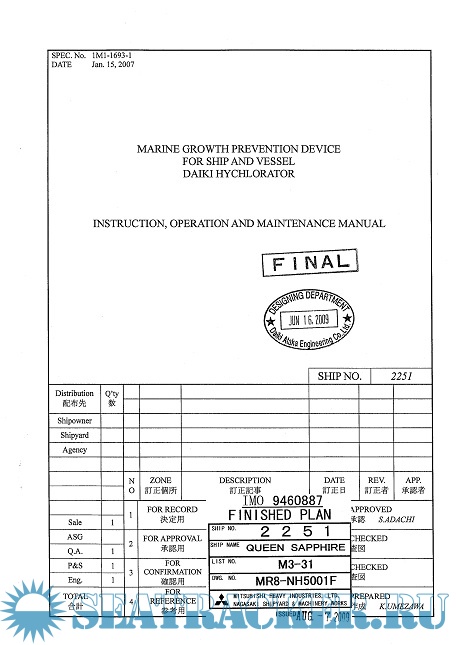 Year: 2020 Language: english Author: Mitsubishi Heavy Industries Genre: Manual Publisher: Mitsubishi Format: PDF Quality: eBook Pages count: 58 Description: This Equipment is provided for preventing the deposition and growth marine organism to achieve as anti-fouling effect using sterilizing action. Seawater is generally a weakly alkalize squeeze solution containing about 3% of sodium chloride.