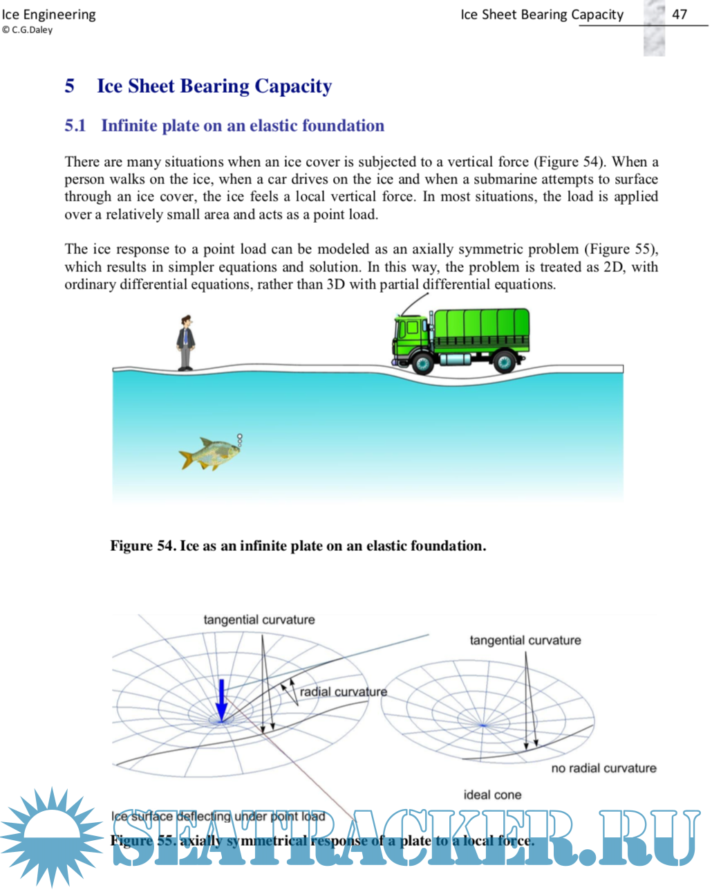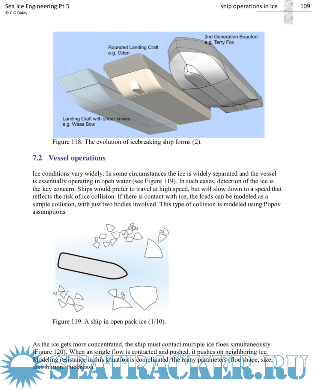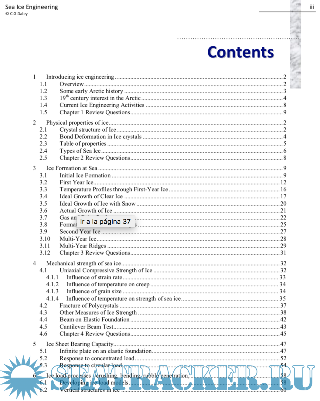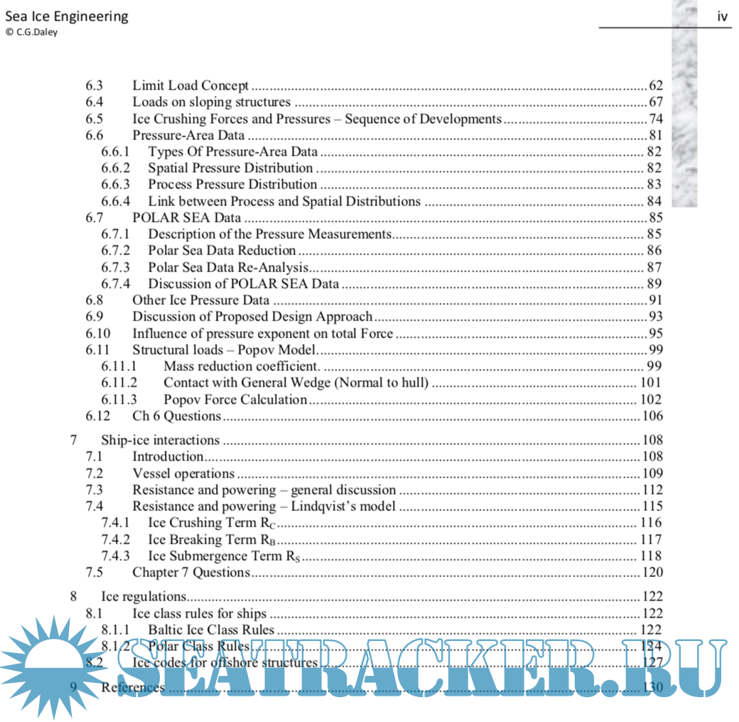 Year: 2010 Language: english Author: Claude G. Daley Genre: Textbook Publisher: Claude G. Daley Edition: 1 ISBN: n/a Format: PDF Quality: eBook Pages count: 154 Description: Ice engineering covers a variety of subjects, mainly involving the interaction of ice with marine structures, as well as the use of ice as a construction material. The focus of this presentation is on ocean and offshore applications. While much of the material on ice properties and mechanics also applies to other ice engineering topics (such as river ice and coastal ice problems), the applications focus here will be on the action of ice on offshore structures and the interaction of ships and ice. A partial list of topics of interest would include: Powering and performance of ships in ice Structural design of icebreaking ships Design of offshore structures in ice Assessment of ice loads in various situations Model scale simulation of ship-ice interaction Study of iceberg behavior for management and towing Ice engineering is a wonderful field of study, mainly because there is still so much to study. Like the Polar Regions, the field has been only partially explored, by a relative few. Luckily for many of us, interest in the subject is again growing strongly. This course will aim to cover the basic ideas and methods. Glaciology is the name for ice science. It is the scientific study of all forms and properties of ice, not just the study of glaciers. A lot is known about ice as a substance. We know its chemical structure, its morphology (form and structure) and its thermodynamic properties. Glaciology provides one of the fundamental supports for ice engineering. Newtonian and continuum mechanics provides a second fundamental support for ice engineering. We can borrow much from Newton as we seek to understand how ice behaves as it contacts ships and structures. The third leg holding up much of ice engineering knowledge is field and experimental observations, together with a lot of guesswork. Ice behavior is often exceedingly complex. When ice contacts a structure, the result is a cascade of fractures and pulverization. Continuum mechanics models, smooth as they are, have never really explained the discontinuous mess that is broken ice. We do have models, even some good ones. We just have too many different models. For the present, ice engineers need to be aware of the empirical evidence and the various models that have been proposed to explain the observations.