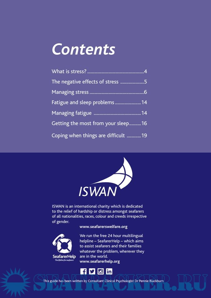 Description: 'Managing Stress and Sleeping Well at Sea’ is part of ISWAN’s series of Good Mental Health Guides for Seafarers. Seafarers face a number of challenges, some of which may be shared by other professions, like long working hours and shift work, and some that are unique, like long periods away from home, living and working in the same place, lack of shore leave, adverse weather, noise and vibration and even the risk of piracy.