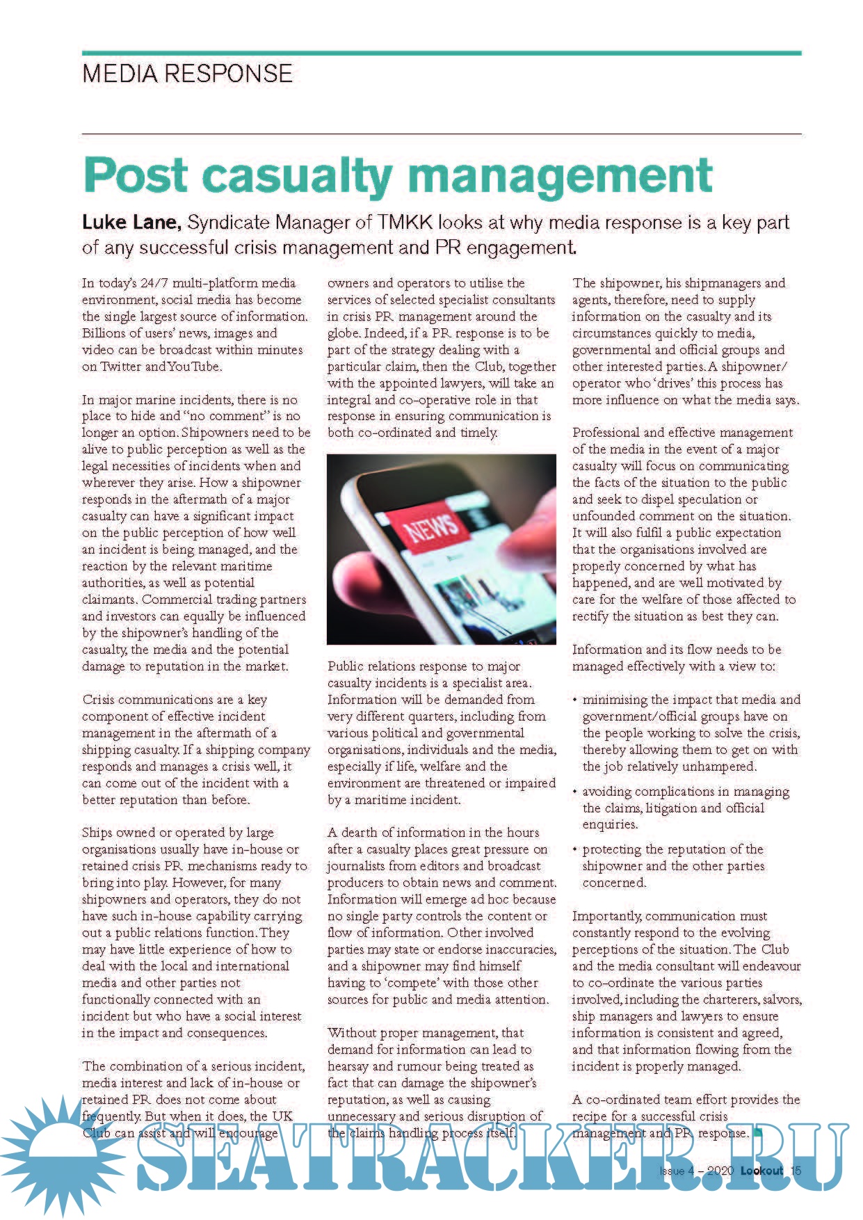 Year: 2020 Language: english Author: UK P&I Club Genre: Periodical (magazine) Format: PDF Quality: eBook Pages count: 16 Description: Lookout is a bi-annual newsletter from the UK P&I Club that collates the most relevant and topical content from across the Club’s global network. It covers subjects such as people claims, loss prevention, defence and industry specific items.