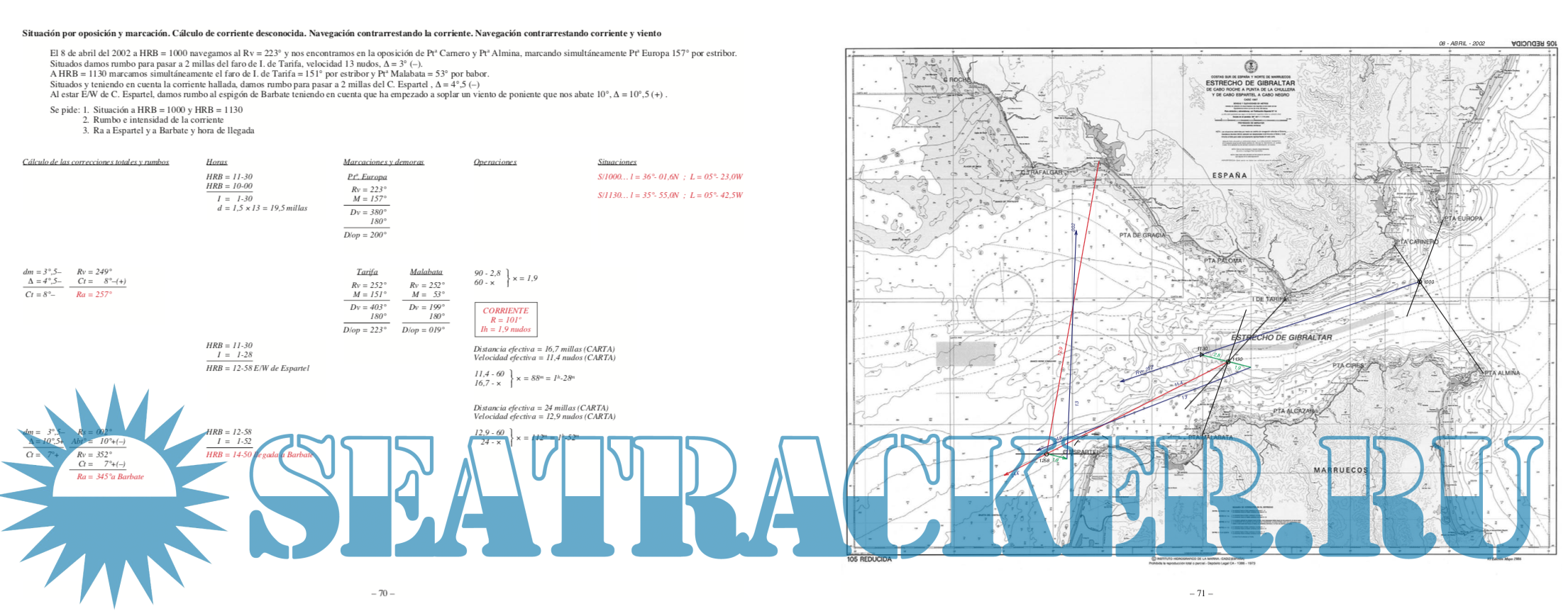 On the right page we can see on the chart 105 REDUCED (Strait of Gibraltar) or 945 REDUCED (From the Adour river to the Cape of Santa Catalina), the graphic resolution of the exercises.