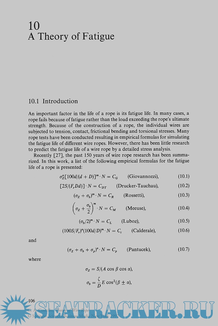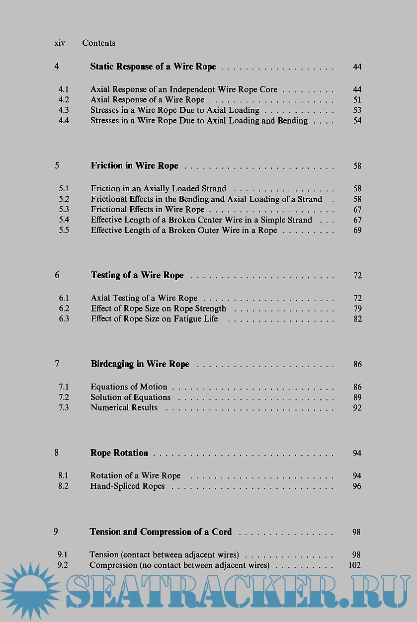 Description: This manual deals with the analysis of the static behavior of wire ropes under different loading conditions, and with the various theories of the fatigue. In recent years, considerable progress has been made in the development of models used to predict the response of ropes. Since there are so many parameters that can vary in the construction of a rope, such models can be used to determine the effects of possible variations of these parameters on the performance of a rope. Numerous examples are worked out to illustrate the theory, and the test results discussed. This second edition includes new chapters on tension and compression of a cord, fatigue, and assumptions and approximations used. Topics are treated with a clear language and many details of the solution steps are given; most of the cases are clarified by numerical examples. The book's aim is to be a comprehensive theoretical review of the mechanical behavior of wireropes, that can also be seen as a good handbook for those who are interested in practical design and evaluation of stresses in ropes with any geometry and cross-section.