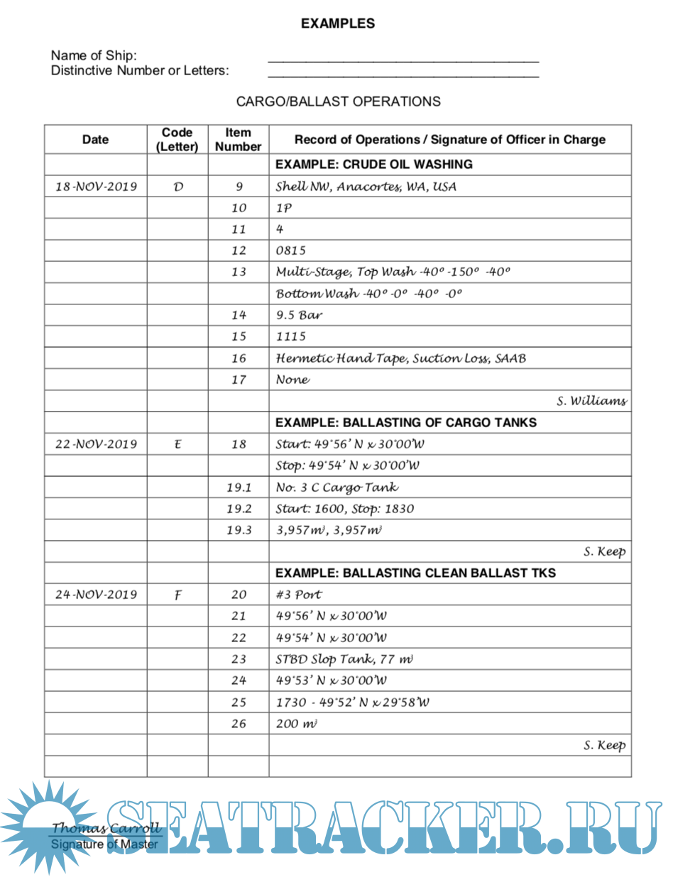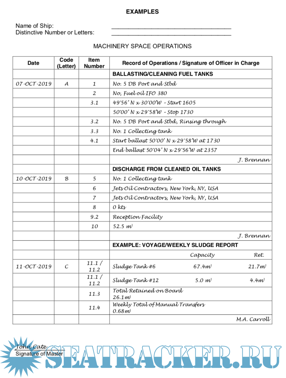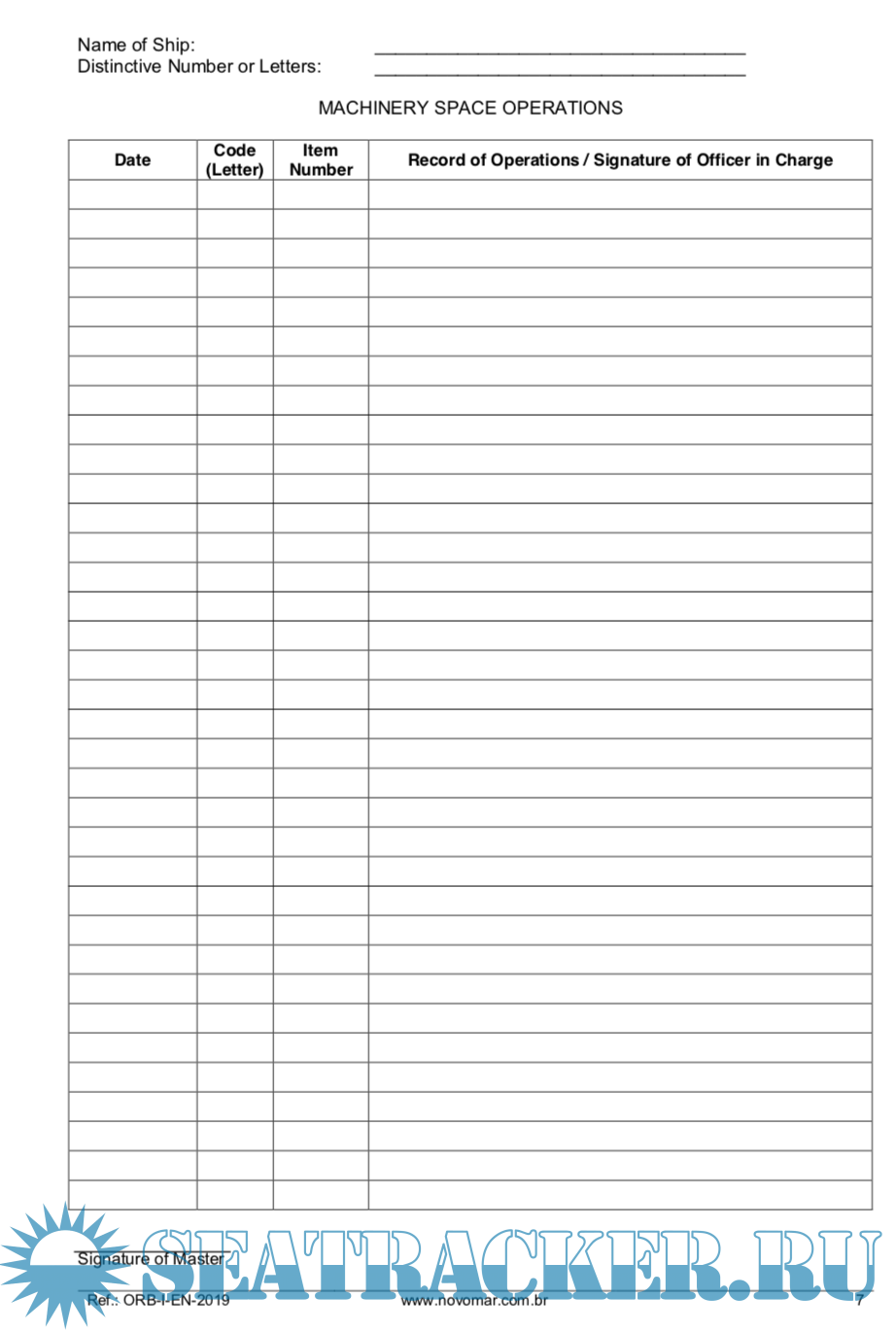 The following pages of this section show a comprehensive list of items of machinery space operations which are, when appropriate, to be recorded in the Oil Record Book Part I (Machinery Space Operations) in accordance with regulation 17 of Annex I to MARPOL 73/78. The items have been grouped into operational sections, each of which is denoted by a letter Code.