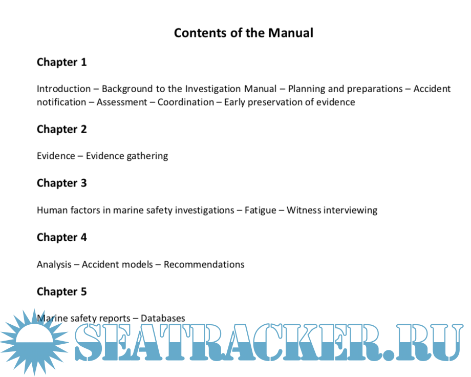 Description: This manual is intended as support material for national marine investigation organizations which conduct investigations under the IMO Casualty Investigation Code (CI Code), which came into force on 1 January 2010. It has been collated from various sources and contains examples of industry best practice to assist investigators and investigation organizations in carrying out their roles. The intention of the manual is to build on the guidelines agreed by the IMO, to provide investigators with a basic platform from which to develop the necessary skills to carry out efficient and effective investigations, and to provide a ready reference tool.