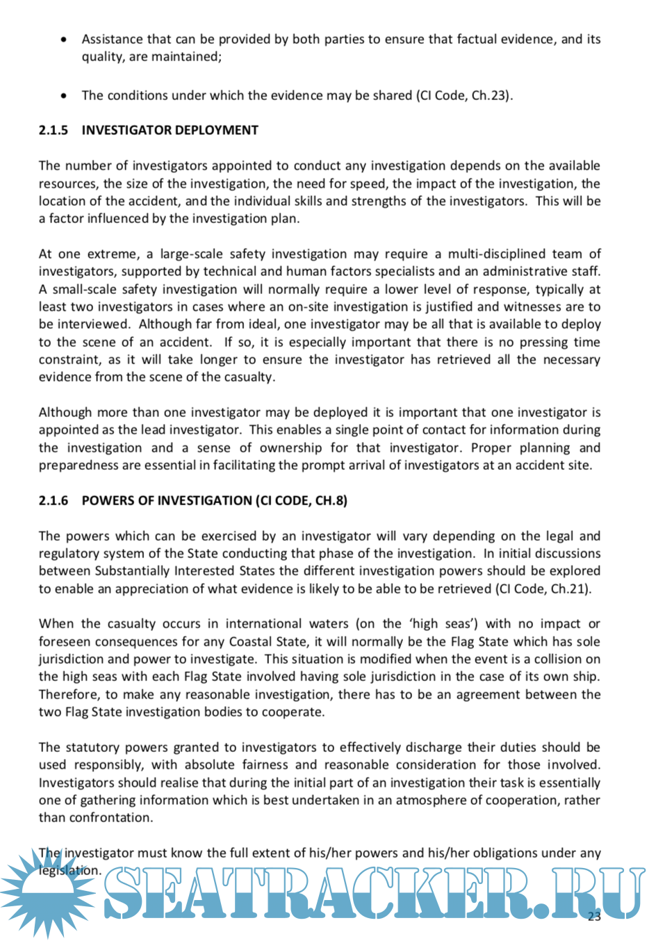 The CI Code incorporates and builds on the best practices in safety investigation and seeks the promotion of cooperation and a common approach to marine casualty and marine incident investigation between States. While the CI Code specifies some mandatory requirements, it also recognises the variations in international and national laws and includes many recommended practices as a result.