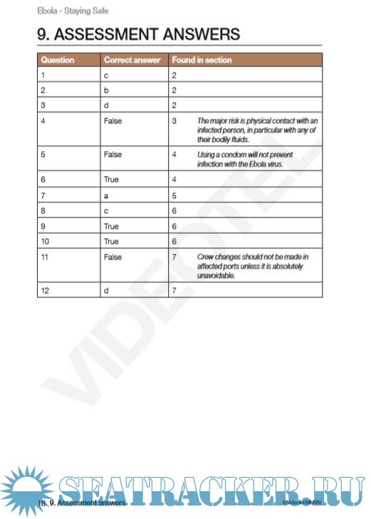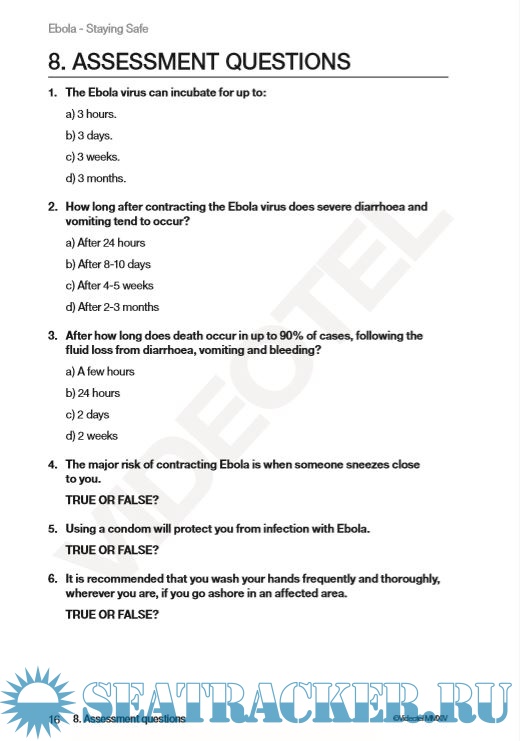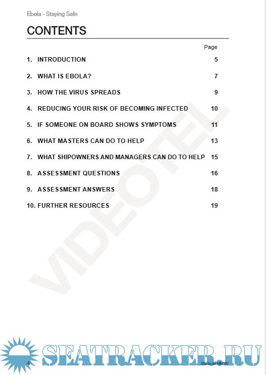 Ebola – Staying Safe is intended as a timely introduction to the dangers of Ebola, and how it could affect ships scheduled to visit ports where the disease has been reported. The programme is aimed at crew, shipowners and managers. By doing this training, they will understand: • the nature of the disease: its symptoms, how it is treated, and how it spreads • the steps they can take to avoid becoming infected with Ebola • what to do if someone on board starts to develop symptoms • what Masters can do to protect everyone on board • what shipowners and managers can do to help • the importance of everyone playing their part in helping to keep themselves and others safe from infection This workbook summarises the key points made in the video and includes recommendations for further reading, websites of organisations that have issued guidance on Ebola or may be of assistance, and assessment questions that can be used to reinforce the learning.