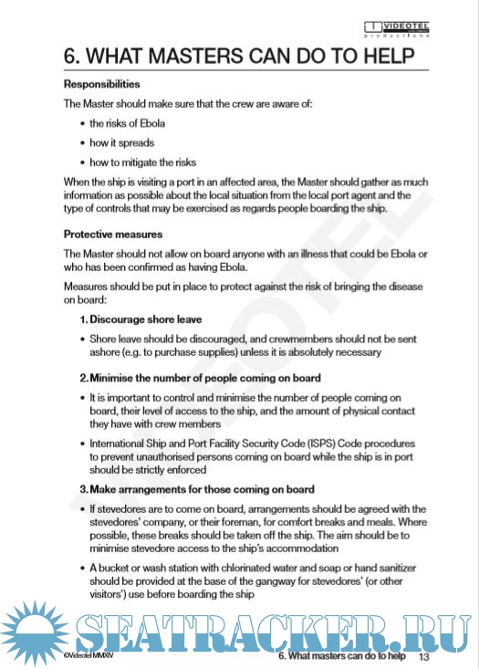 Description: Ebola – a serious maritime security issue Ebola is a severe, often fatal illness. It is thought to have originated in East and Central Africa, but recently shifted focus to West Africa, where it triggered the largest Ebola outbreak in history. In August 2014, the World Health Organization (WHO) declared it a ‘Public Health Emergency of International Concern’ (PHEIC). Even though the risk of contracting Ebola during a visit to affected countries is very low, and infected people usually feel so unwell that they cannot travel, the fact that the illness has a long incubation period and is difficult to diagnose in the early stages means that people who have contracted the virus could carry it to other countries. International transport is therefore under the spotlight, as it could enable this highly contagious and potentially fatal disease to spread. Ebola therefore represents a serious maritime security issue, and shipowners, managers and Masters have a responsibility for taking measures to prevent the illness from being passed on by crew or passengers, as well as a duty of care for protecting everyone on board.