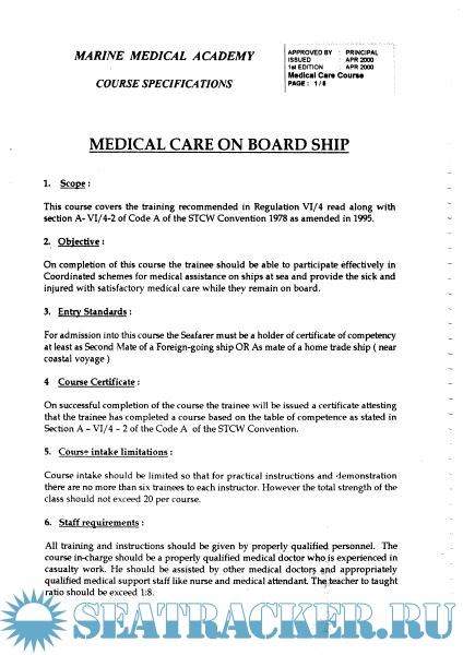 Description: On completion of this course the trainee should be able to participate effectively in Coordinated schemes for medical assistance on ships at sea and provide the sick and injured with satisfactory medical care while they remain on board.