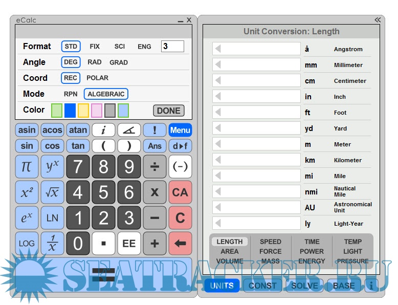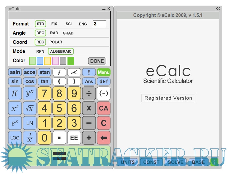 Year: 2009 Version: 1.5.1 Developer: eCalc Platform: Windows 64-bit OS compatibility: yes System Requirements: Windows 98/XP/7/10 Localization: english Crack: Registered version Description: Experience the full power of the eCalc Scientific Calculator on your Windows Desktop. In addition to all the powerful calculating features of eCalc you get the option of six color schemes and a sliding side palette which you can open and close to maximize your desktop space. eCalc Scientific is a very advanced scientific calculator that offers you all the functions to suit your mathematical needs, from the most simple to the most sophisticated, such as trigonometric, logarithmic, and angular functions, fractions, unit conversions, and more. It also includes math helping tools, such as a constant descriptor and an equation solver. eCalc Scientific Calculator's interface is well designed and completely self-explanatory. It has the same look and feel of a real scientific calculator. Its buttons are very clearly labeled, and are grouped by colors according to their functionality. The area representing the display is big, and it has been divided into two sections - one to show the current operands and symbols, and another for the previous operations and the results history. The buttons included in this main interface give you access to the most common functions, like sin, cosine, tangent, and their corresponding inverse functions; the four basic operations, PI constant, square and square root, logarithms, exponentials, factorial, parenthesis, and more. There is also a button to access the display's menu, where you can select your preferred Format mode (among STD, FIX, SCI, and ENG) and the number of decimals to be displayed, an Angle mode (among DEG, RAD and GRAD), a Coordinates mode (among REC and POLAR), and a Working mode, between RPN and ALGEBRAIC. Here you can also change the color of the program's interface. In the top side of the display there is a bar that allows you to change quickly among all the modes mentioned above, and a couple of buttons to scroll the display up and down. eCalc Scientific is an excellent calculator which provides you with a complete set of mathematical functions. Unfortunately, it frequently shows a "Register Now" reminder, followed by a short delay, until a link with the "I will register later" message appears - clicking on it will allow you to continue with your work. As an alternative, there is also an on-line version of the calculator that works without restrictions, though it obviously requires a working Internet connection. Additional info: Отличный калькулятор, который, в свое время, служил верой и правдой. Не думал, что станет проблемой найти его в сети, но я нашел