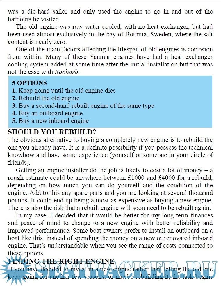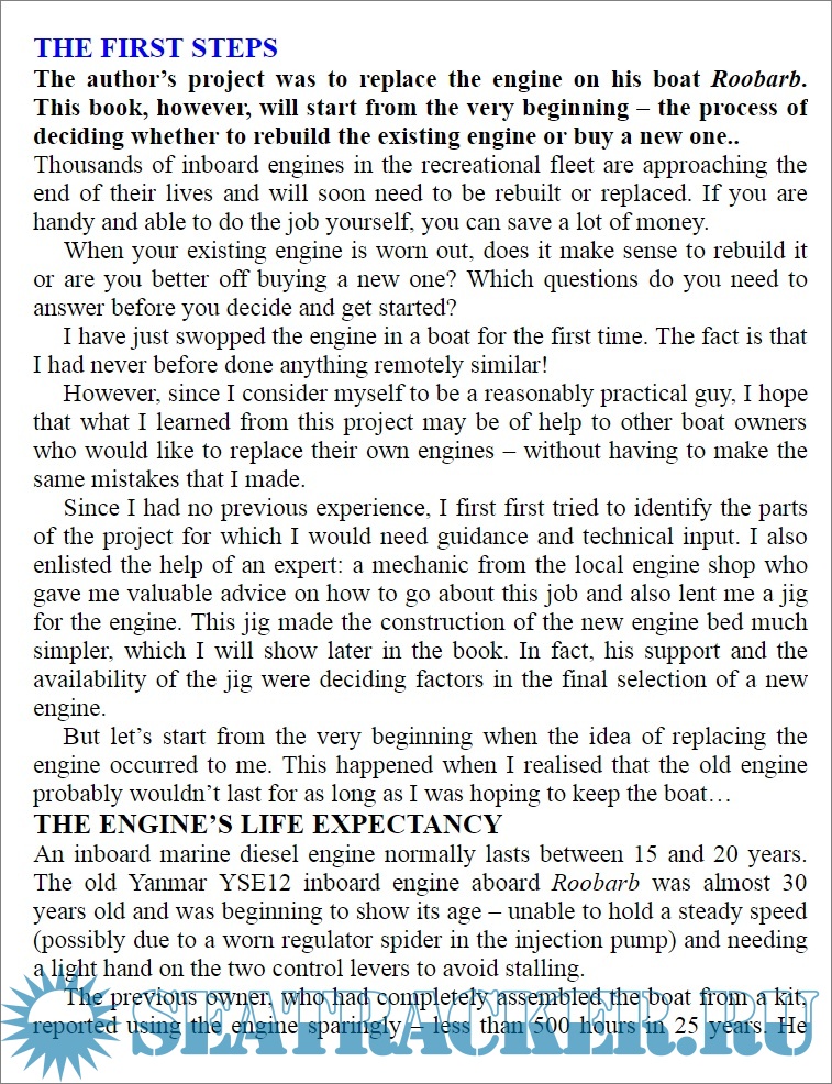 Description: The key about replacing the engine is planning, what worrying about through each stage of the job, and making decisions about how to do it. This book is a projec log, and manages to make a complicated, risky task, an easy-to-follow and fun project, to be carried out alone or with the help of some friends. What seems complex and technically advanced is explained, so that it is within everyone's reach, with a minimum of manual skills. Adaptations to fiberglass structures, repairs with epoxy, alignments and tolerances, electrical circuits, design and maintenance of tanks are explained in a simple and direct way. Topics also cover engine specification and a guide to buy a new engine, engine-gearbox combination, propeller choice, cost planning and budget, maintenance cost and overall price, engine's bed adaption, spare parts, exhaust system, bilge pumps, fuel tanks among others.