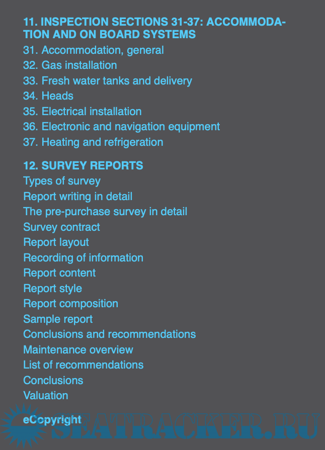Year: 2013 Language: english Author: Paul Stevens Genre: Practical guide Publisher: Bloomsbury Publishing Edition: Electronic Edition ISBN: 978-1-4729-0706-6 Format: EPUB Quality: eBook Pages count: 209 Description: This is the only book linked to a practical surveying course. Highly practical in nature, and packed with detailed close-up photography, step by step procedures, and helpful checklists, this definitive handbook will prove a godsend to small craft owners who want to check out defects on their own boats or on boats they are planning to buy, as well as practicing surveyors and surveying students. Featuring surveying bodies, equipment required, assessing defects (including moisture-related defects, and the use of moisture meters) and their severity, the book guides the reader through conducting a thorough inspection, from keel to topsides, coachroof, stern gear, rigging and much more. The highly practical approach of this book will be invaluable to students of surveying, qualified surveyors and yacht and boat owners everywhere.