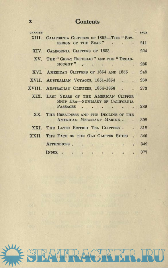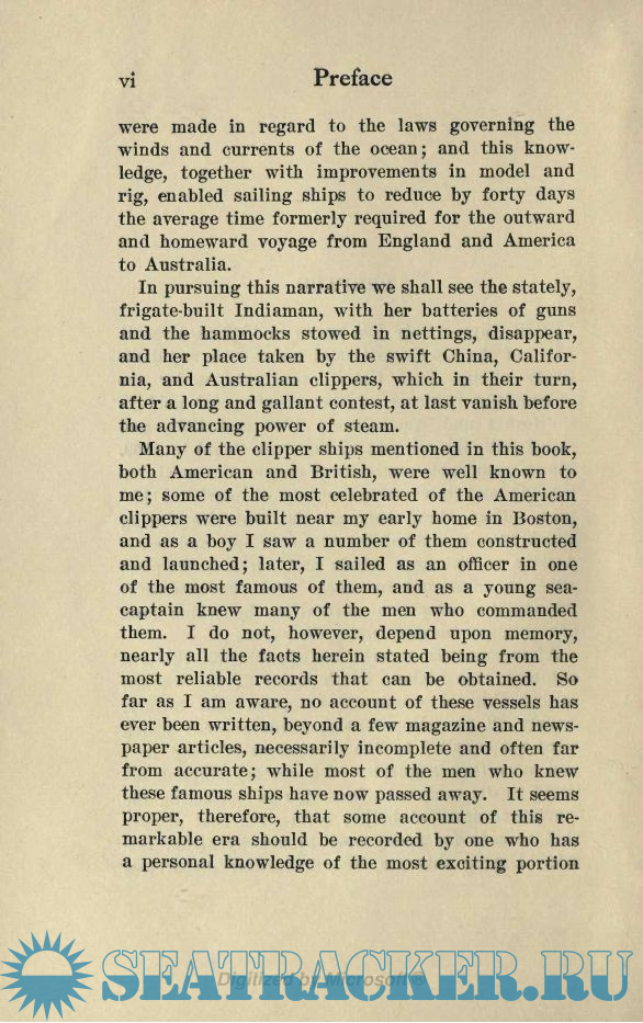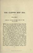 The Clipper Ship Era began in 1843 as a result of the growing demand for a more rapid delivery of tea from China; continued under the stimulating influence of the discovery of gold in California and Australia in 1849 and 1851, and ended with the opening of the Suez Canal in 1869. These memorable years form one of the most important and interesting periods of maritime history. They stand between the centuries during which man navigated the sea with sail and oar — a slave to unknown winds and currents, helpless alike in calm and in storm — and the successful introduction of steam navigation, by which man has obtained mastery upon the ocean.