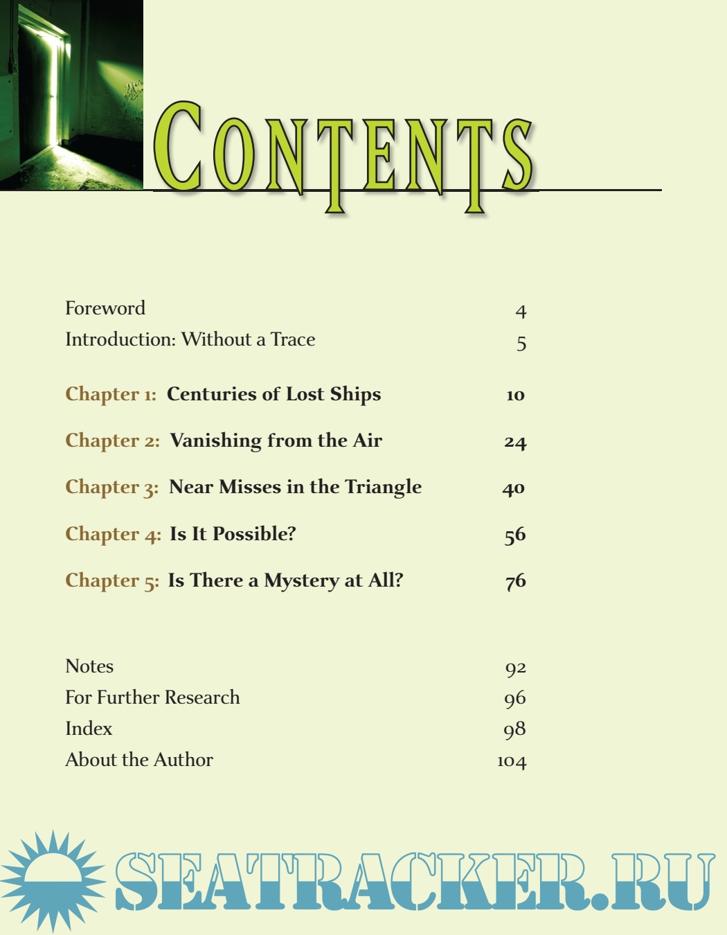 Description: Numerous ships and aircraft have disappeared in the area known as the Bermuda Triangle and no one knows exactly why.This book examines the details of the many disappearances as well as some of the theories -- both otherworldly and down-to-earth -- forthe strange events that have taken place in the Bermuda Triangle.