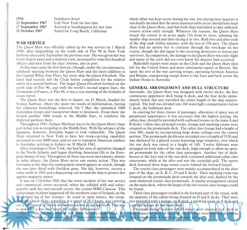 Year: 1989 Language: english Author: Ross Watton Genre: History Publisher: Naval Institute Press ISBN: 0-87021-599-X Format: PDF Quality: Scanned pages Pages count: 146 Description: RMS Queen Mary is a retired ocean liner that sailed primarily on the North Atlantic Ocean from 1936 to 1967 for the Cunard Line (known as Cunard-White Star Line when the vessel entered service). Queen Mary was the flagship of the Cunard Line from May 1936 until October 1946 when she was replaced in that role by Queen Elizabeth. This book gives a service history of the ship, hir photos during the service and many ship's and hir arrangement drawings.