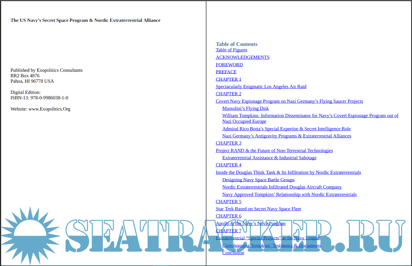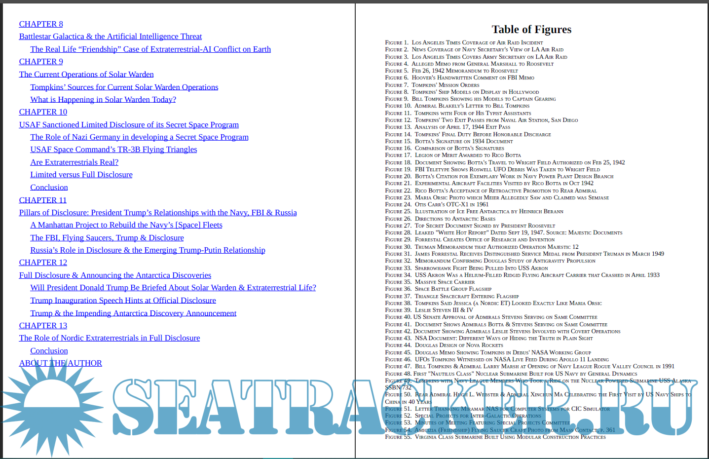 Year: 2017 Language: english Author: Michael Salla, Robert Wood Genre: Normative document Publisher: Exopolitics Consultants Edition: 2 ISBN: 0998603805 Format: PDF Quality: eBook Pages count: 340 Description: The Los Angeles Air Raid on February 24/25, 1942 opened an unprecedented chapter in the evolution of the U.S. Navy. In response to this incident, a covert research program to investigate the feasibility of exotic antigravity propulsion technologies was developed. In addition, Navy operatives were embedded in Nazi occupied Europe to learn about the Germans’ advanced flying saucer programs, and they discovered the Nazis were receiving assistance from two extraterrestrial groups with very different agendas. The debriefing of the operatives took place at Naval Air Station, San Diego, led by Rear Admiral Rico Botta. He instructed a “Disseminator of Naval Research and Information”, William Tompkins, to take confidential briefing packets to select think tanks, corporations and university departments around the country. Later, Tompkins worked with a number of leading aerospace companies to design massive spacecraft for a secret U.S. Navy space program, and was fatefully assisted by extraterrestrial visitors described as “Nordics”. An extensive number of documents substantiate Tompkins’ claims of the existence of a covert Navy program created to study, design and build deep space battle groups. They became operational in the 1980’s. Now the Navy has a new goal to enact a plan to level the universal playing field, and the election of President Donald Trump may just be the wild card they needed to reveal … everything!
