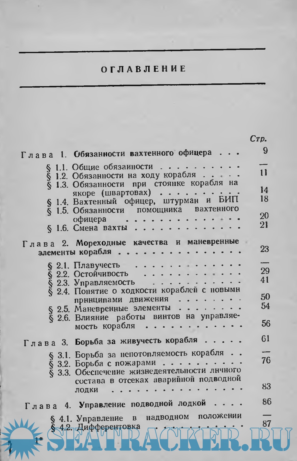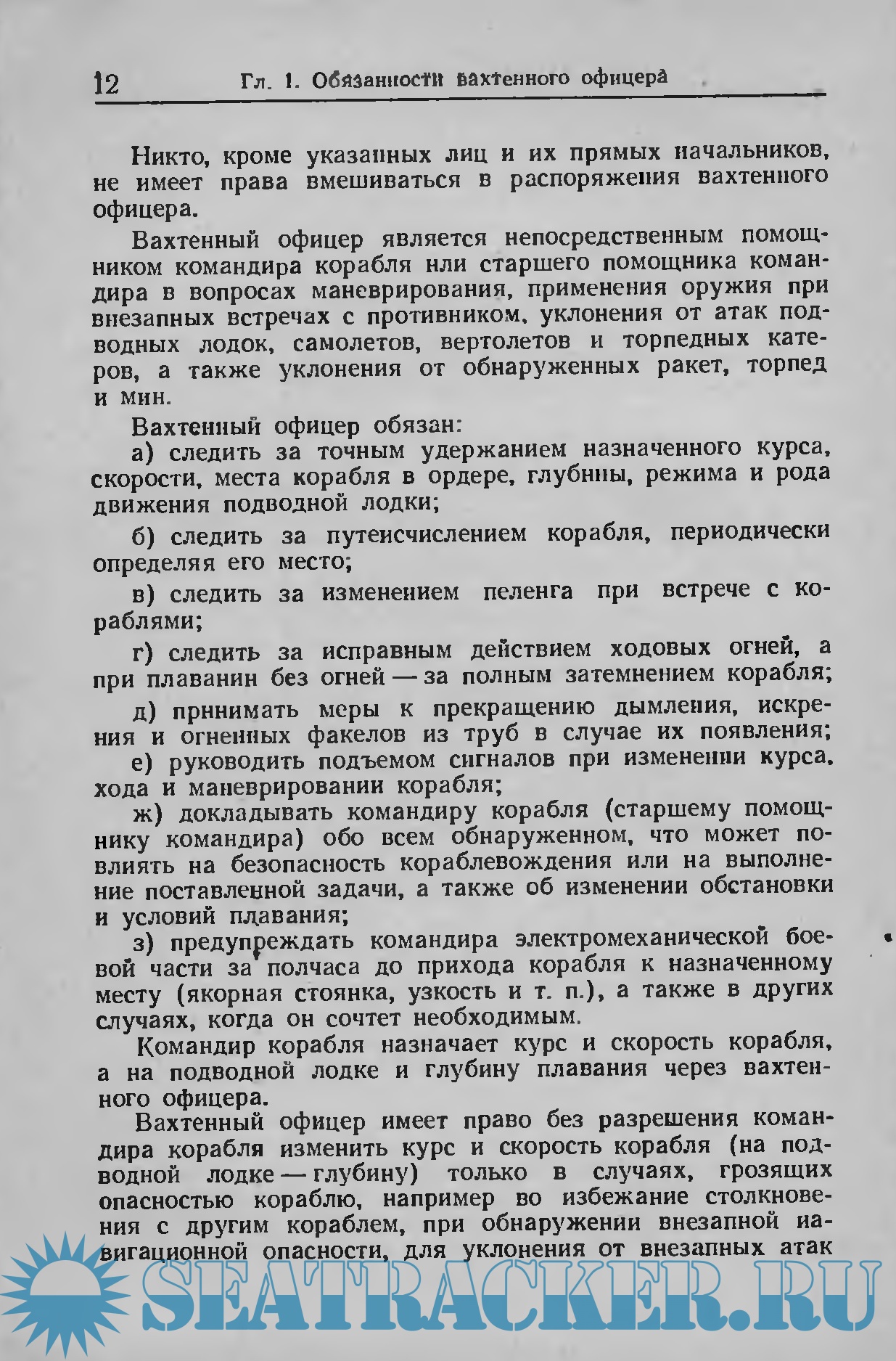 Год выпуска: 1975 Язык: русский Автор: А.П. Проничкин Жанр: Учебное пособие Издательство: Воениздат Формат: DjVu Качество: Отсканированные страницы Количество страниц: 229(423) Описание: Вахтенный офицер управляет корабельной вахтенной службой. Личный состав корабля, кроме лиц, которым вахтенный офицер подчинен, обязан исполнять все требования вахтенного офицера. К исполнению обязанностей вахтенного офицера на ходу и на якоре привлекаются лица, допущенные приказом командира корабля после проверки их знаний в соответствии с требованиями специальной программы. Вахтенный офицер должен иметь бинокль, свисток, мегафон. Кроме того, у него должны быть записная книжка и карандаш. По тревогам вахтенный офицер передает свои обязанности старшему помощнику командира корабля и занимает место согласно расписанию.