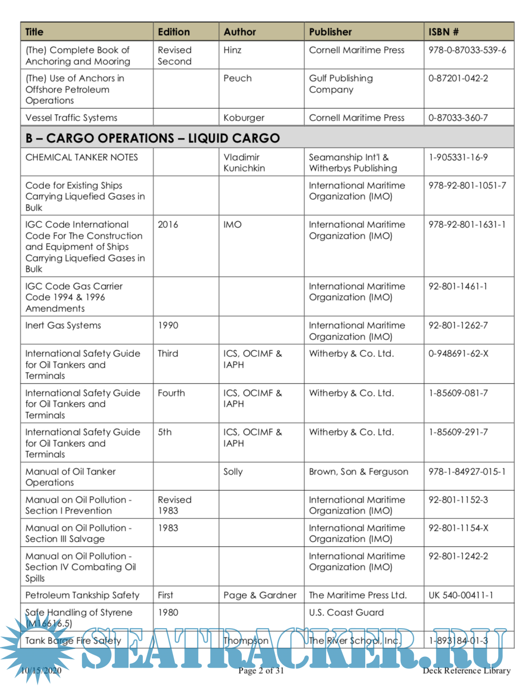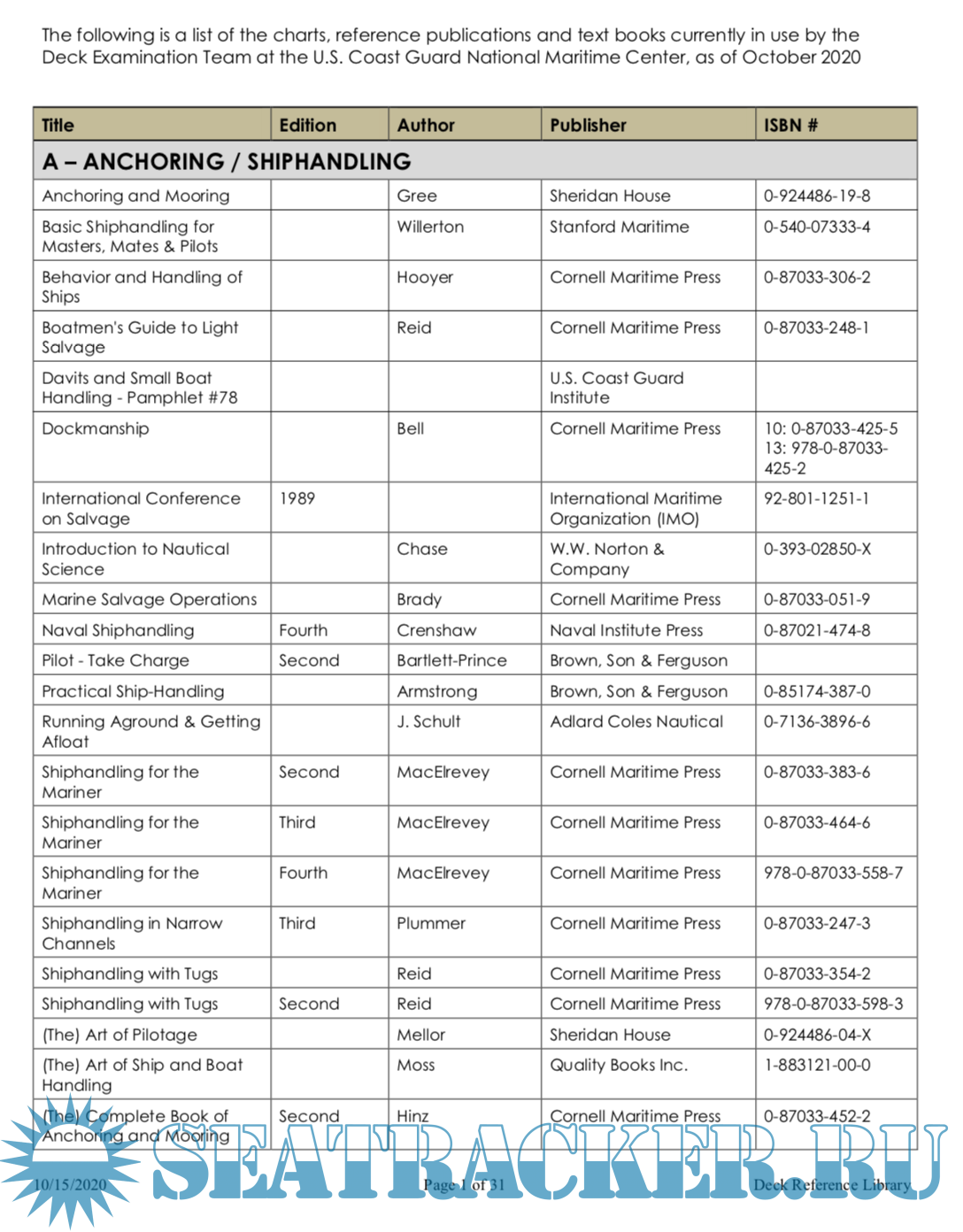 Year: 2020 Language: english Author: US Coast Guard Genre: Guide Publisher: US Coast Guard Format: PDF Quality: eBook Pages count: 31 Description: The following is a list of the charts, reference publications and text books currently in use by the Deck Examination Team at the U.S. Coast Guard National Maritime Center, as of October 2020