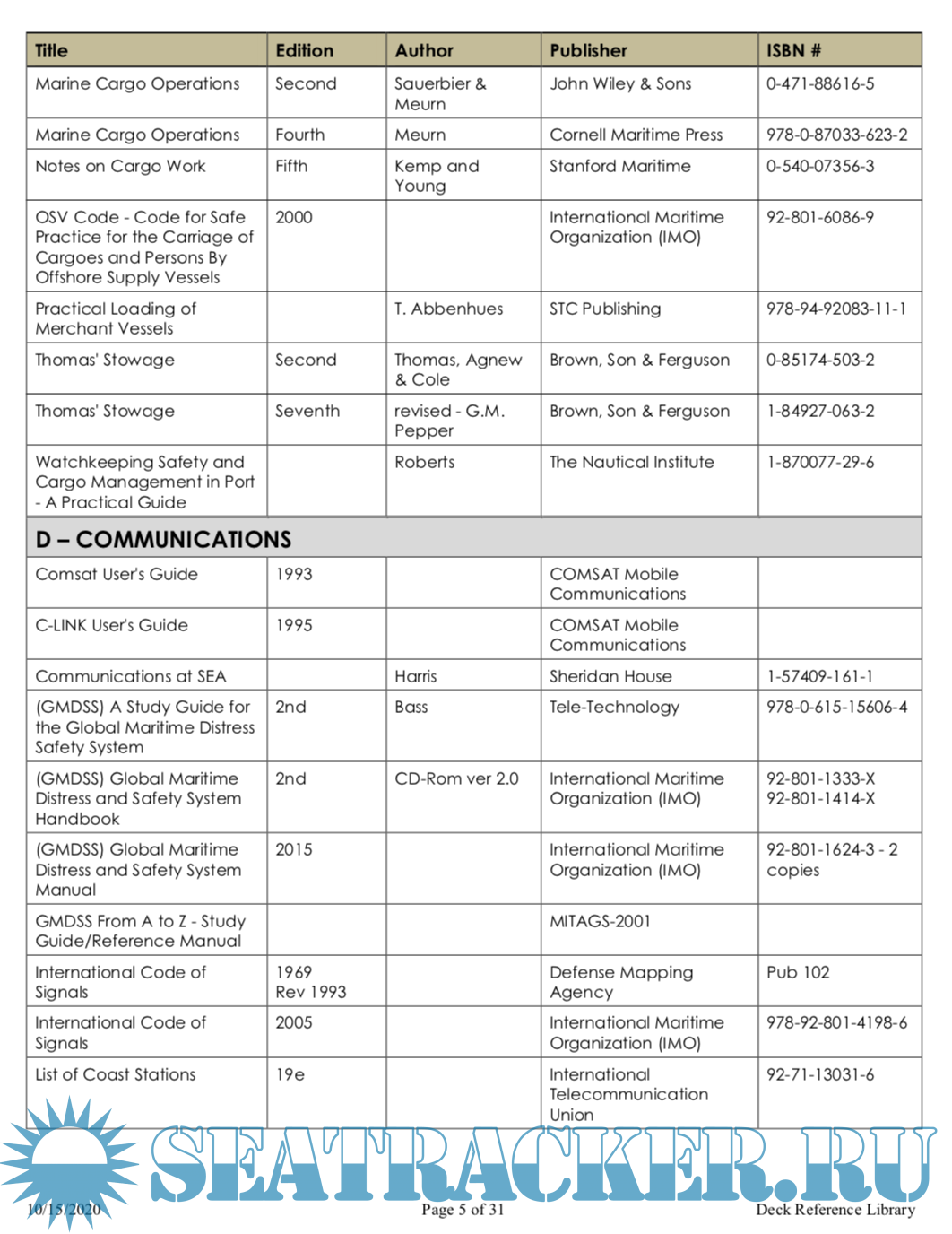 Description: The following is a list of the charts, reference publications and text books currently in use by the Deck Examination Team at the U.S. Coast Guard National Maritime Center, as of October 2020