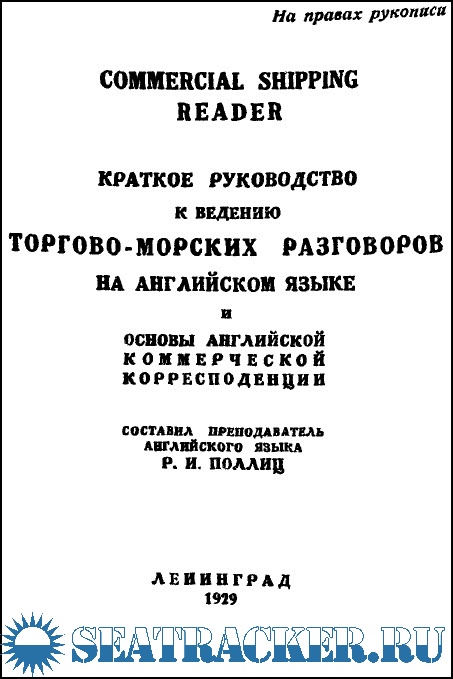 Описание: Приступая к составлению своего пособия, я первоначально имел в виду курсантов среднего Комсостава Морского Транспорта НКПС, которым необходимо уметь пользоваться английской морской коммерческой терминологией, вести элементарные разговоры на английском морском языке, а попутно также и иметь некоторое представление о ведении коммерческой корреспонденции. В дальнейшем же, приняв во внимание, что мой труд может до известной степени явиться руководством не только для означенных курсантов, но и для других лиц, изучающих английский морской язык, я включил в это пособие несколько статей специального морского коммерческого и технического характера.