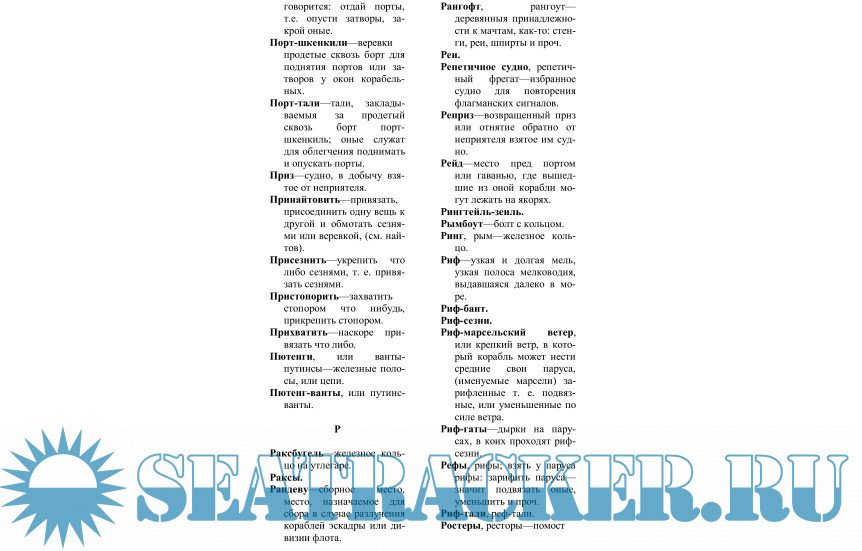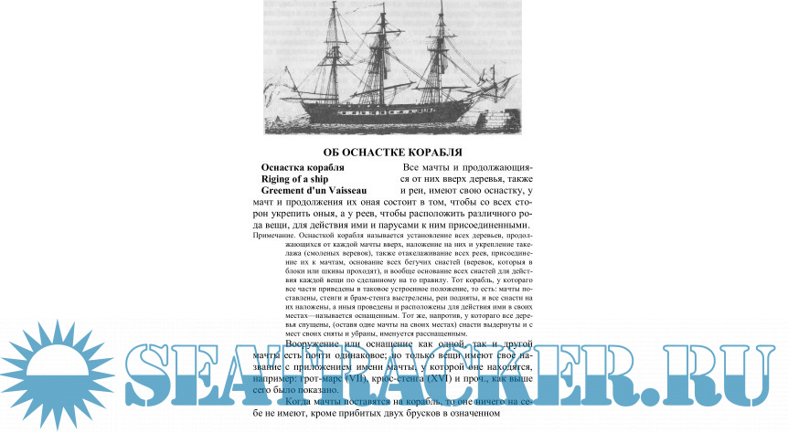 ОГЛАВЛЕНИЕ Историческая спрака 2 Показание знаков, под коими находятся в планах означенныя вещи 22 Общия понятия 23 Нагрузка корабля 25 Название скреплениям и всем видимым частям корабля 35 Звание мест, где что кладется на военном корабле 42 О вооружении корабля 51 Название дерев 56 О реях 67 Особый способ делать реи из двух дерев 69 Название реев 71 Пропорции мачт и прочаго, употребляемыя в Английском военном флоте 79 Таблицы размеров мачт, стенг и реев, в Английском военном флоте употребляемыя 83 Об оснастке корабля 115 Вооружение реев 134 О поднятии пушек на корабль 152 О якорях с принадлежностями 154 Опробованные размеры и вес якорей в Английском флоте 157 Число якорей, полагаемых на каждом корабле в Английском флоте, с их весом и ценою 159 О привязывании канатов к якорям 161 Употребление новаго рода шпилей 162 Размеры шпилей в Английском военном флоте 164 О поднятии на корабль из воды якорей 165 О руле 167 Описание потеси 171 Особенныя принадлежности к вооружению корабля 172 О парусах и снастях при них находящихся 177 Нижние паруса 180 Средние паруса 187 Верхние паруса 195 Таблицы парусов 206 О плавающих судах по морям вообще 217 Балтийскаго корабельнаго флота суда 217 Балтийскаго гребнаго флота суда 218 Транспортныя и ластовыя суда 219 Мелкия гребныя суда 219 Иностранныя военныя суда 220 Купеческия или коммерческия суда 220 Яхты и им подобныя суда 221 Различныя на морях суда 221 Объяснение Планам: План А, нагруженнаго корабля в разрезе по длине его 231 План В, фрегат, вооруженный смоленным такелажем 231 План С, фрегат, вооруженный бегучим такелажем 234 План D, фрегат под одними косыми парусами 236 План Е, корабль, идущий в полветра под прямыми парусами 238 План F, фрегат, идущий полным ветром, у которого убирают верхние паруса 240 Краткий словарь морским терминам 242