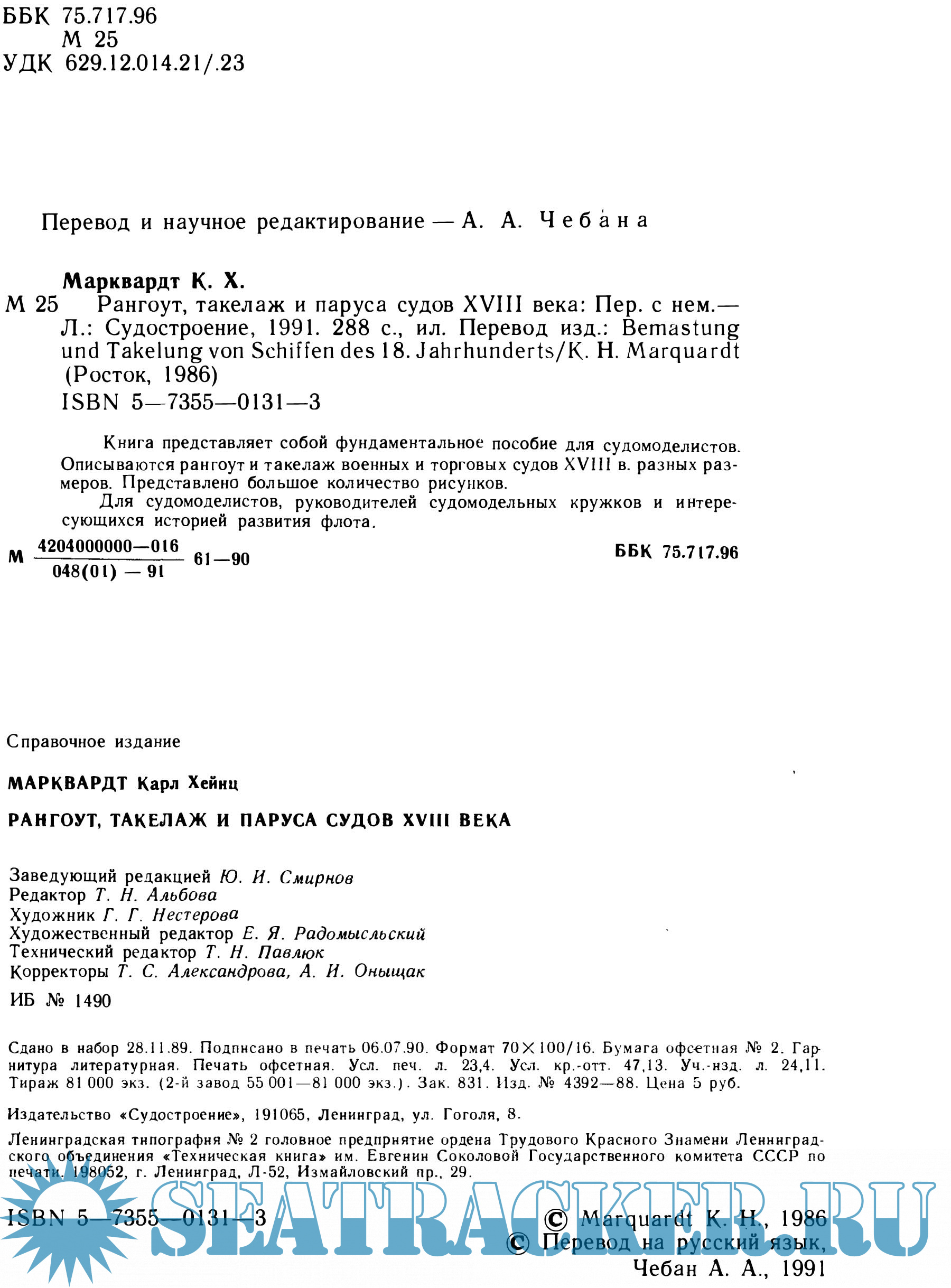 Год выпуска: 1991 Язык: русский Автор: Марквардт Карл Хайнц Жанр: Руководство Издательство: Судостроение Формат: PDF/DjVu Качество: Распознанный текст без ошибок (OCR) Количество страниц: 289 Описание: Многие годы, в течение которых автор занимался судомоделизмом, при разработке чертежей моделей судов постоянно сталкивался с тем, что чрезвычайно трудно получить достаточные и достоверные в отношении определенной эпохи данные о рангоуте и такелаже судов. Многие моделисты, безусловно, тоже встречались с этой проблемой : большинство построенных моделей должны были бы иметь лучшее вооружение. Как часто точные сведения о корпусе кончаются, когда речь заходит о рангоуте, такелаже и парусах, где фантазия не имела границ. Причина этому - скудость построечных данных. Чертежи корпусов судов XVI l l в., часто разработанные вплоть до деталей, для многих судов и сейчас сохранились в оригиналах. Сведения же о парусном вооружении можно получить лишь из некоторых общих обзорных рисунков и фрагментарных данных о деталях, выбранных из различных источников. Последние необходимо отыскать, изучить. и привести в соответствие для реконструкции планов вооружения различных судов. Идея предлагаемой читателю книги начала формироваться в 1976 г. При разработке построечного чертежа русского линейного корабля XVIII в. в авторе, как в реставраторе с большим стажем, стало расти желание иметь руководство, которое могло бы ответить на большинство вопросов, касающихся вооружения судов XVIII в. Эта мысль вскоре даже стала преобладать, оттеснив на задний план описание линейного корабля. Судно XVIII в. своей резьбой и окраской привлекает почти каждого любителя исторических моделей судов не только как объект искусства, но и прежде всего своей принадлежностью той или иной эпохе. Задача данной книги - дать моделисту специальные знания по парусному вооружению судна. Приведенные здесь данные выбраны из большого числа работ как описываемой эпохи, так и современных.